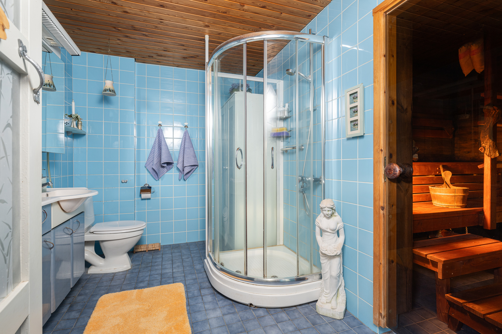Lattialämmitys, peilikaappi, suihkukaappi ja wc-istuin, seinät (kaakeli), lattiat (laatta) |