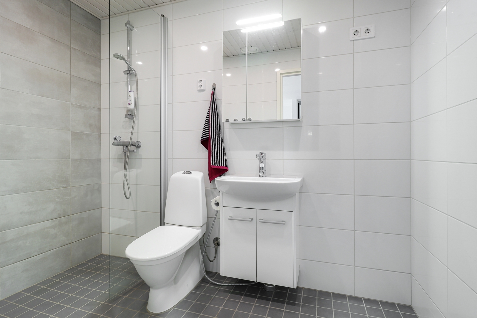Suihku, wc-istuin, lattialämmitys, peilikaappi, pesukoneliitäntä, suihkuseinä, allaskaappi ja kiinteät valaisimet, seinät (kaakeli), lattiat (laatta) |