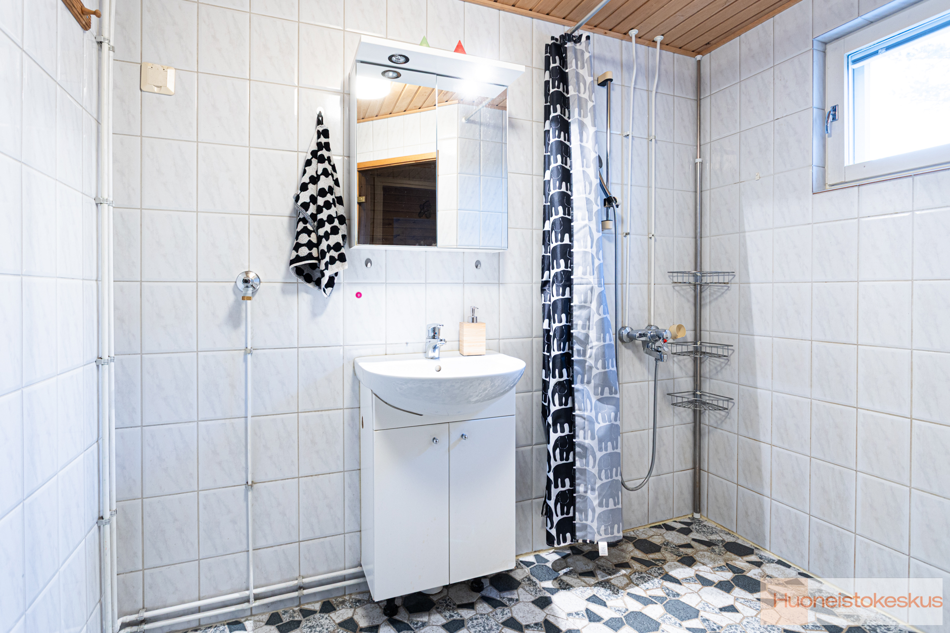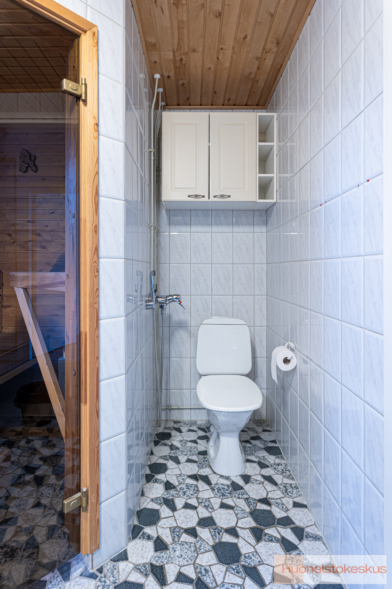 | Kylpyhuoneen kuvaus | WC-istuin, suihku, pesukoneliitäntä, peilikaappi, allaskaappi ja bidee-suihku, seinät (kaakeli), lattiat (laatta) |