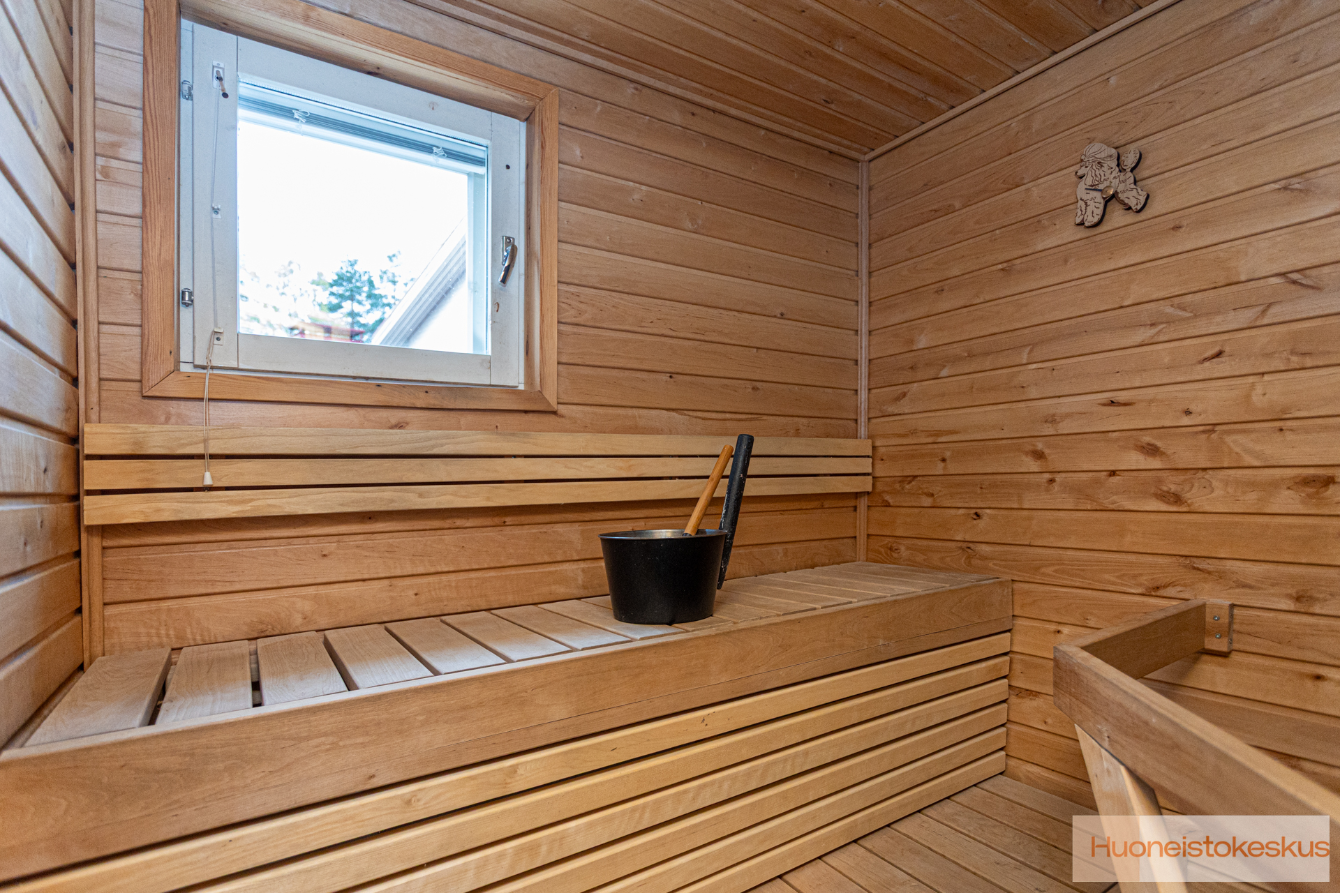 | Saunan kuvaus | Seinät (paneeli), lattiat (laatta), Sähkökiuas, Sauna on remontoitu 2025. |