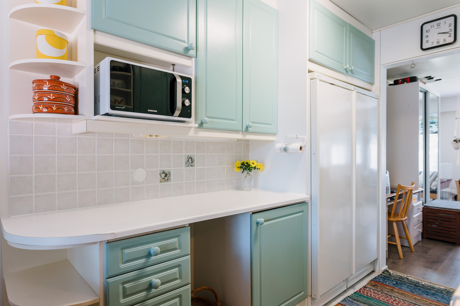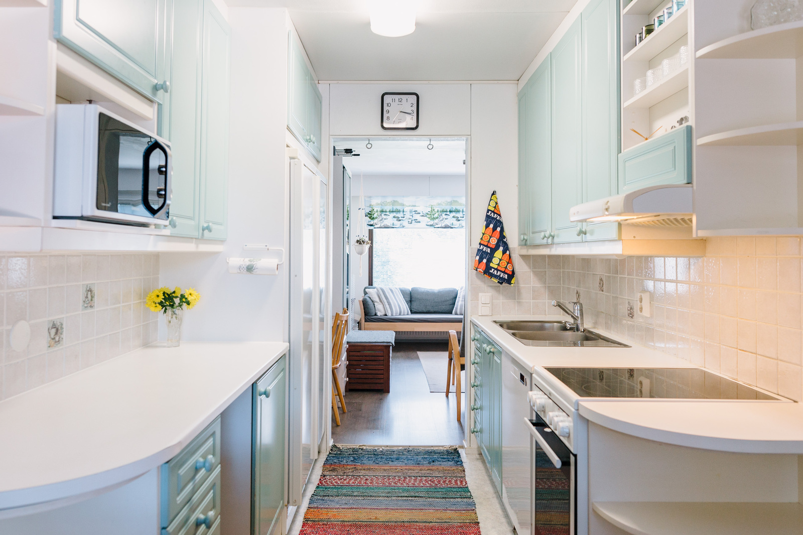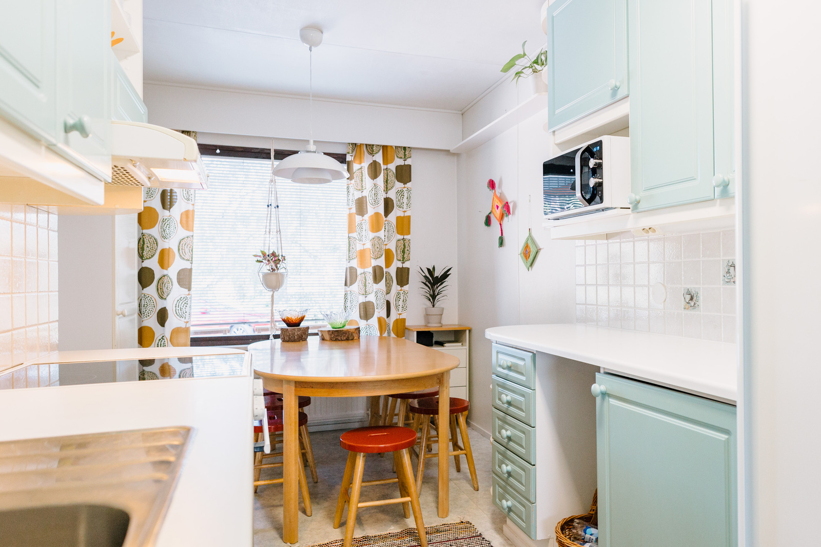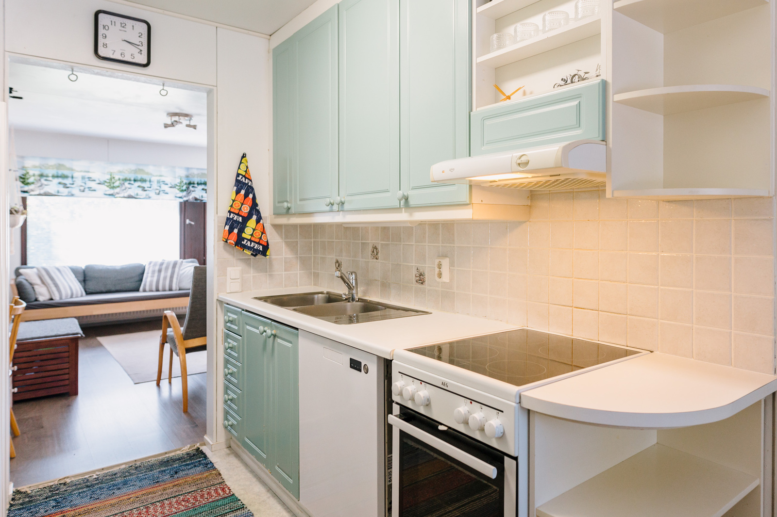 | Keittiön kuvaus | Liesi (Keraaminen liesi), seinät (maali), lattiat (muovimatto), astianpesukone, jääkaappi, erillinen pakastin, liesituuletin ja kiinteät valaisimet |