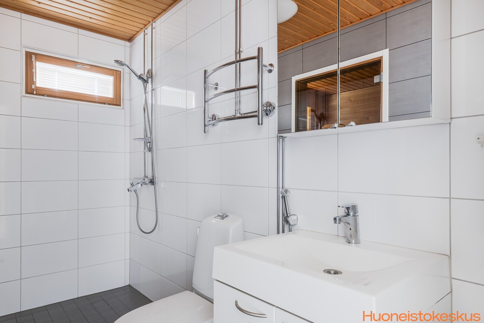 | Kylpyhuoneen kuvaus | Suihkuseinä, lattialämmitys, suihku, wc-istuin, peilikaappi ja allaskaappi, seinät (kaakeli), lattiat (laatta) |