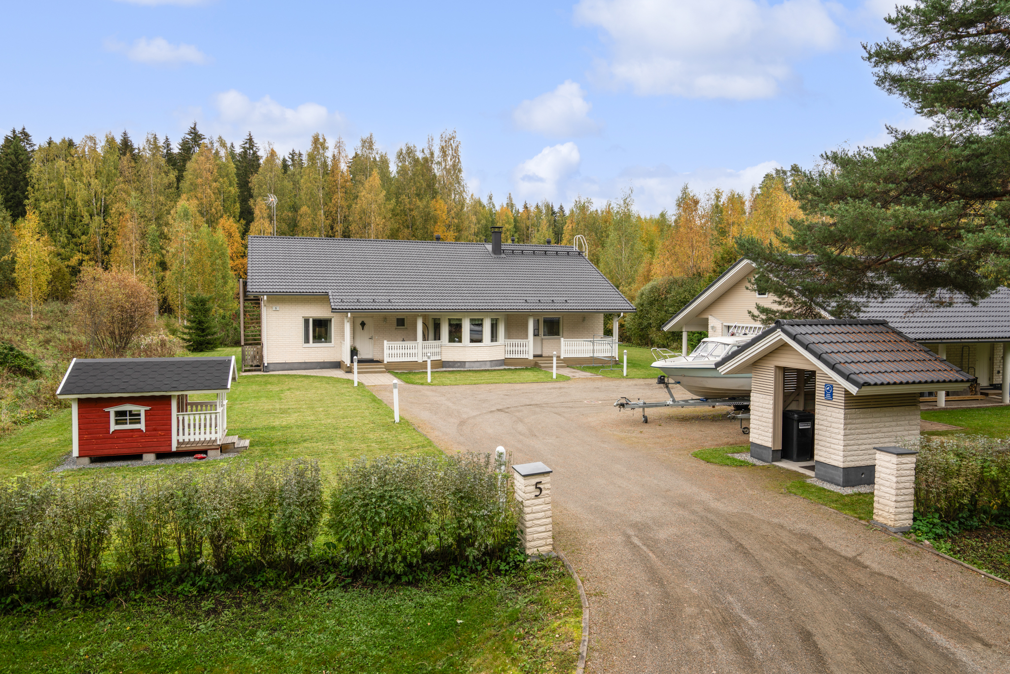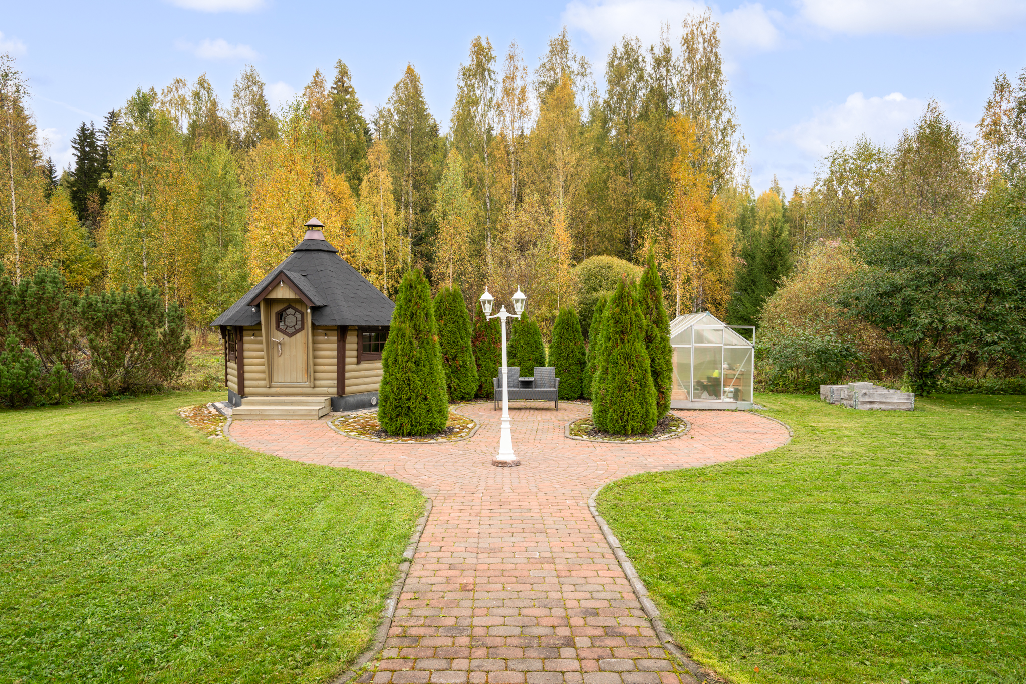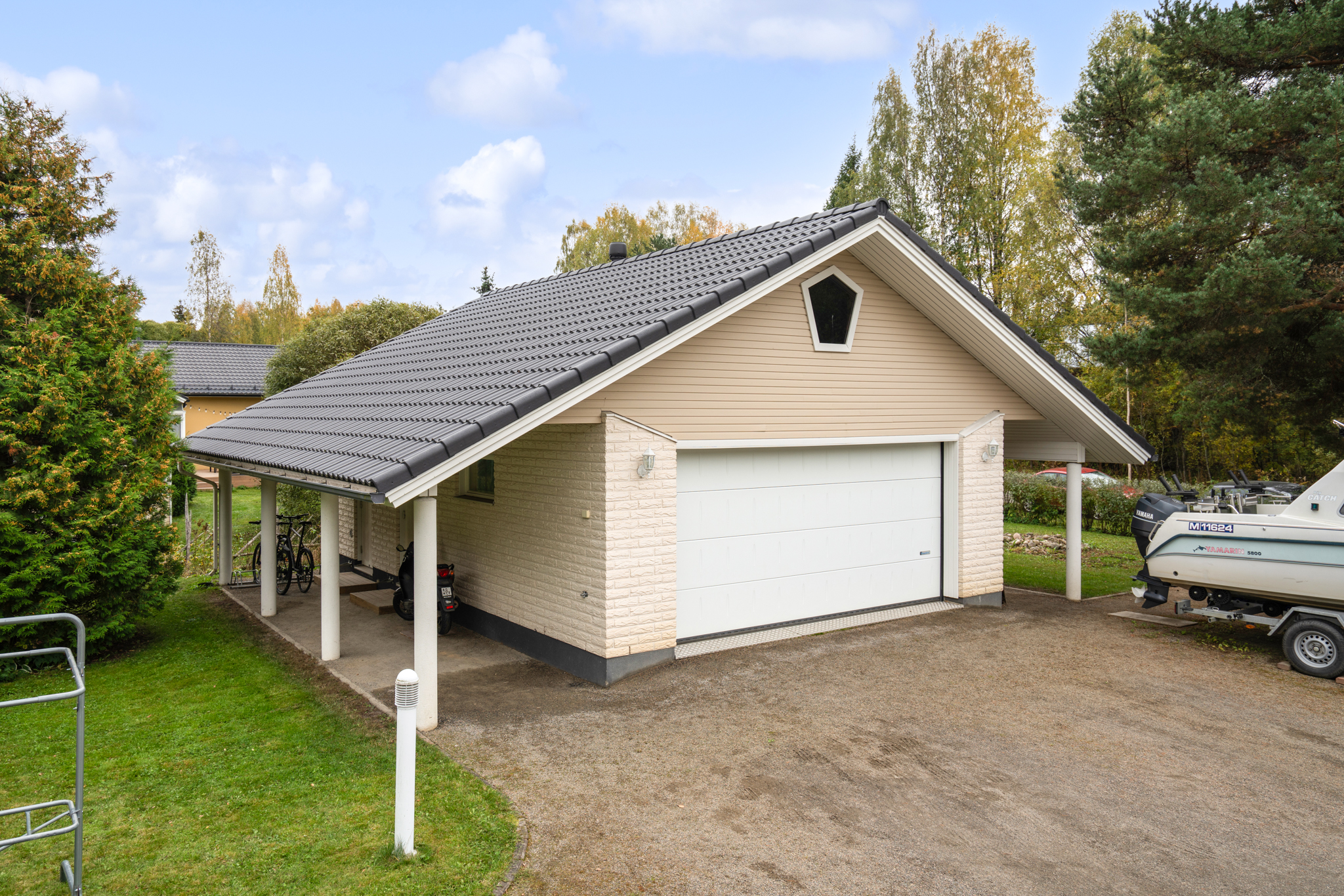 | Muut rakennukset | Päärakennuksen lisäksi kiinteistöllä on talousrakennus, joka käsittää kahden autotallin sekä varastotilan (lämpöeristetty vesik. ll.) sekä teknisen tilan. Takapihalla grillikota sekä etupihalla leikkimökki. |