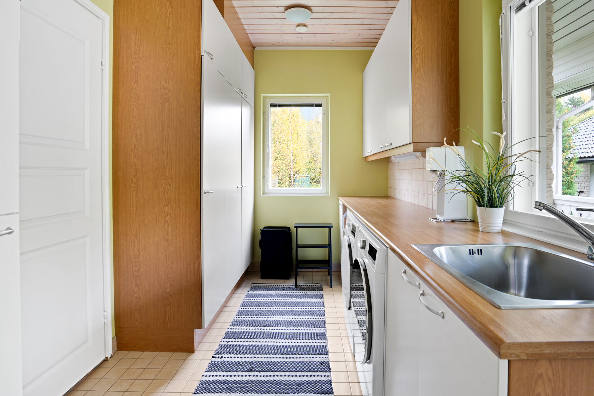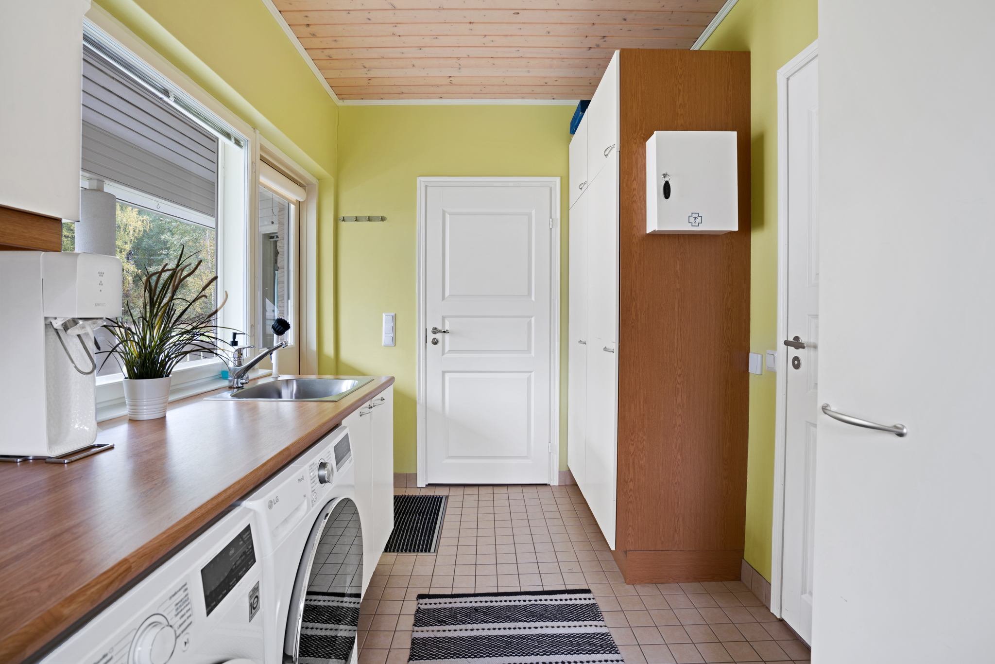 | Kodinhoitohuoneen kuvaus | Pesukoneliitäntä, lattialämmitys, pesuallas, lattiakaivo, kurapiste, pöytätaso ja pyykkikaapit, lattiat (laatta), seinät (maali) |