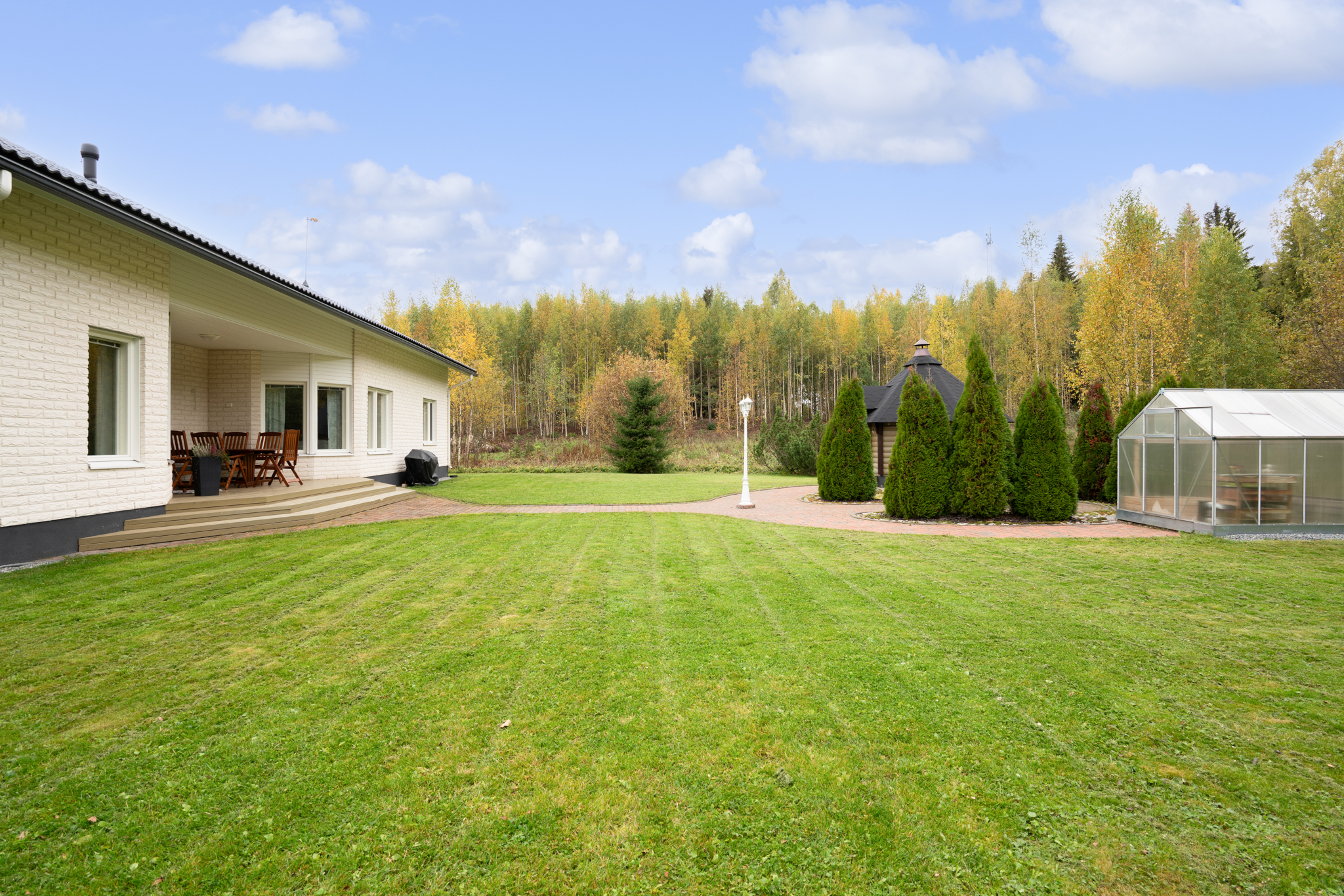 Tämä kokonaisuus sijaitsee 2251 m2 omalla ja suojaisalla tontilla. Pihapiiristä avautuu autotallirakennus, joka käsittää erillisen varastotilan sekä teknisen tilan (lämpöeristettyjä kaikki). Takapihan puolella grillikota, kasvihuone sekä etupihalta löytyvä leikkimökki perheen pienimmille odottamassa. Kahdelta sivustaltaan puistoalueeseen rajoittuva tontti, piha-alue nurmetettu ja kuluväylät laatoitettu molemmin puolin taloa.
