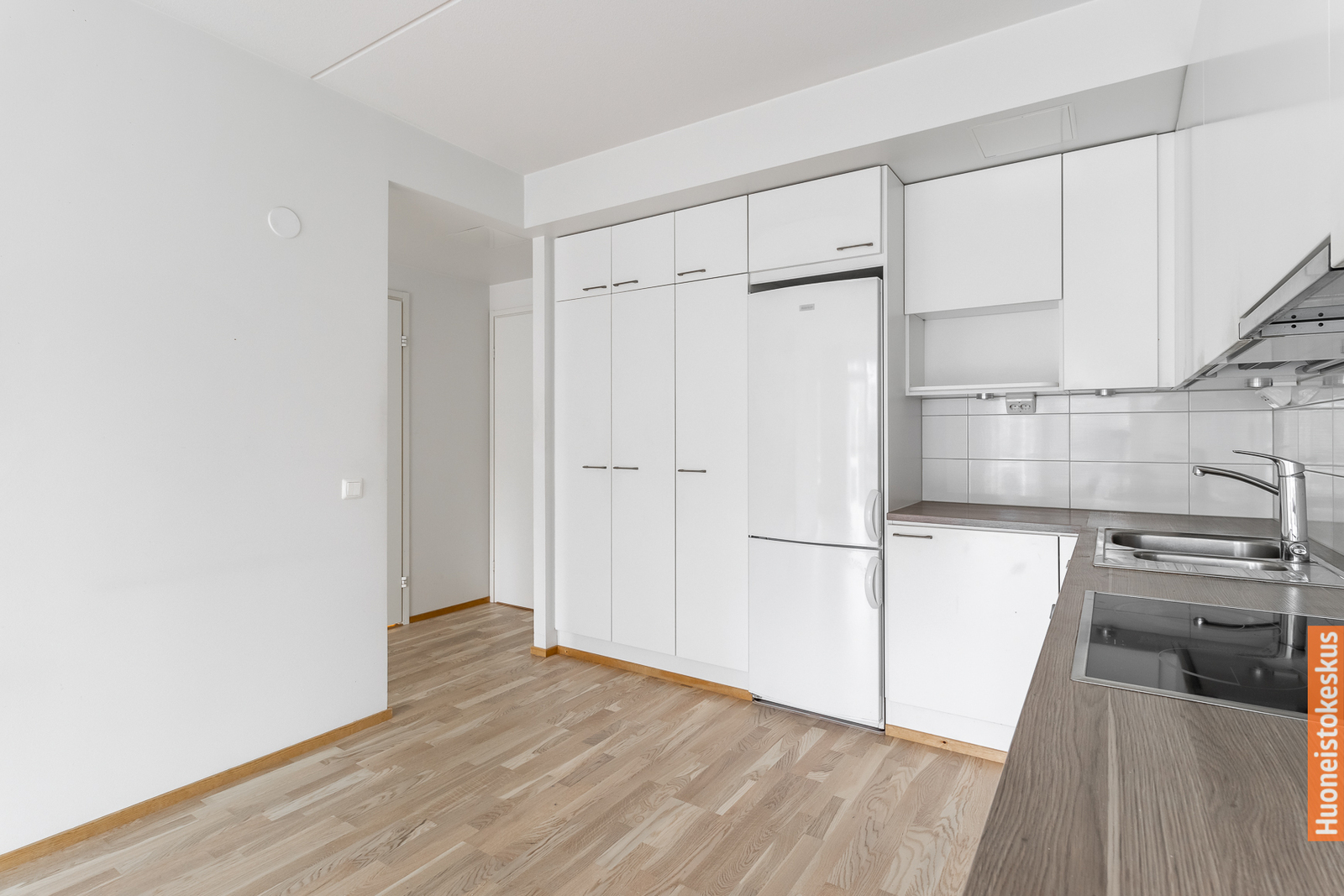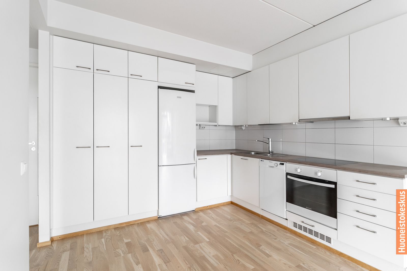 | Keittiön kuvaus | Liesi (erillisuuni, liesitaso), seinät (maali), lattiat (parketti), astianpesukone, erillisuuni, jääkaappipakastin, liesituuletin ja kiinteät valaisimet, liesitaso, Keittiön kaapeissa hieman kulumisen jälkiä. |
