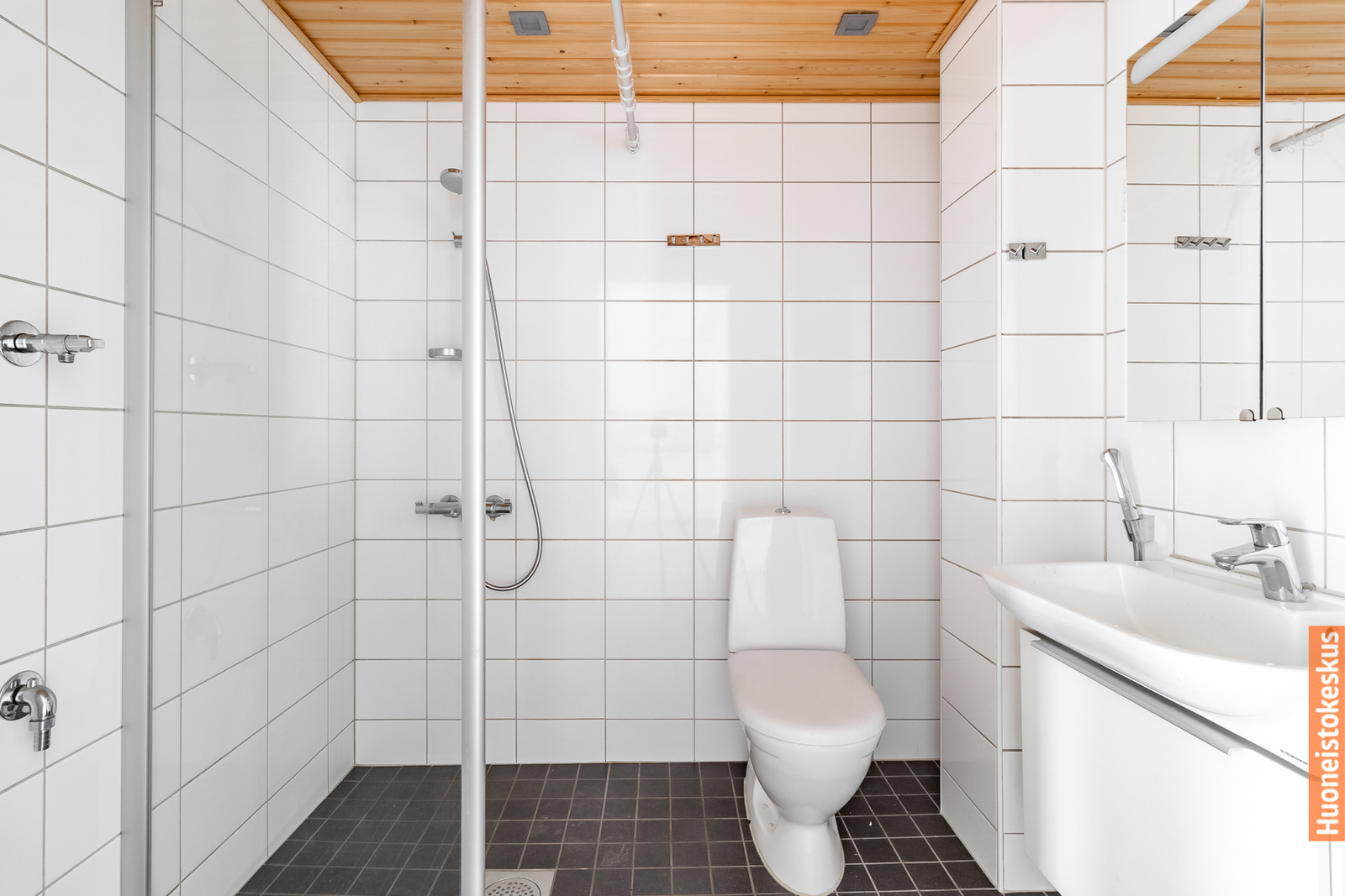 | Kylpyhuoneen kuvaus | Pesukoneliitäntä, suihkuseinä, peilikaappi, suihku, wc-istuin ja kiinteät valaisimet, seinät (kaakeli), lattiat (laatta) |
