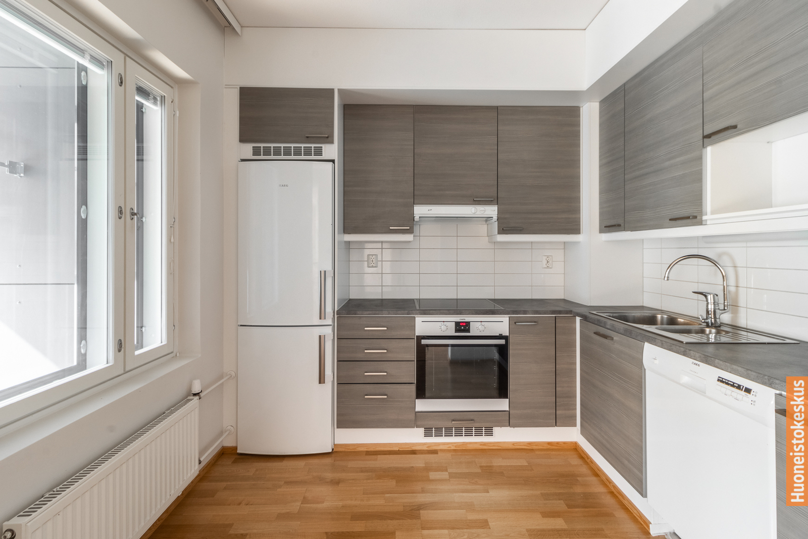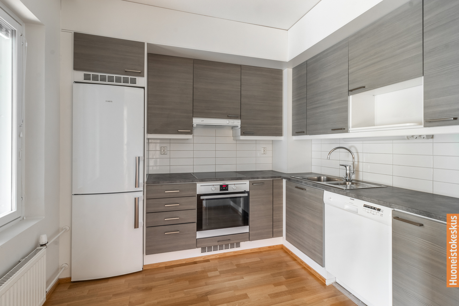 | Keittiön kuvaus | Liesi (integroitu), työtasot (laminaatti), seinät (maali), lattiat (parketti), jääkaappipakastin ja liesituuletin |