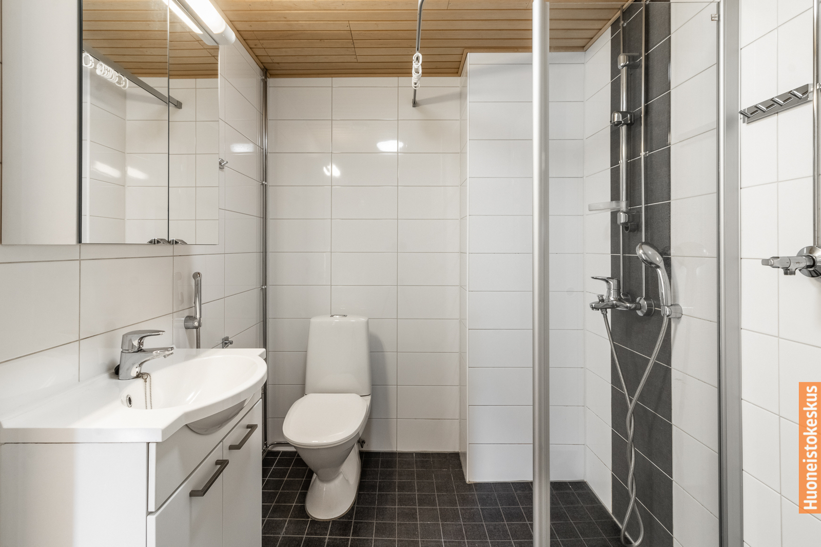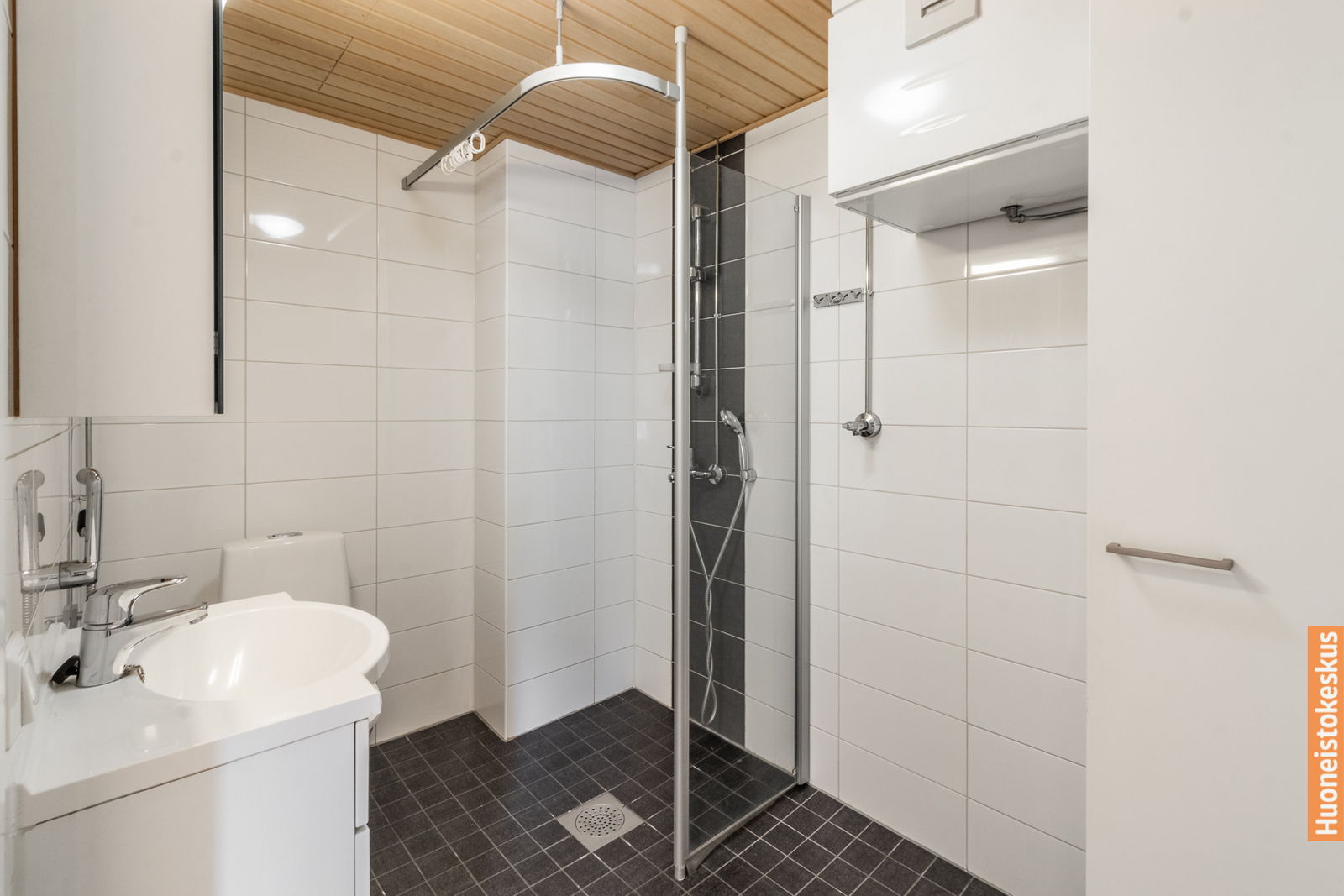 | Kylpyhuoneen kuvaus | Suihkuseinä, pesukoneliitäntä, wc-istuin, suihku ja lattialämmitys, seinät (kaakeli), lattiat (laatta) |