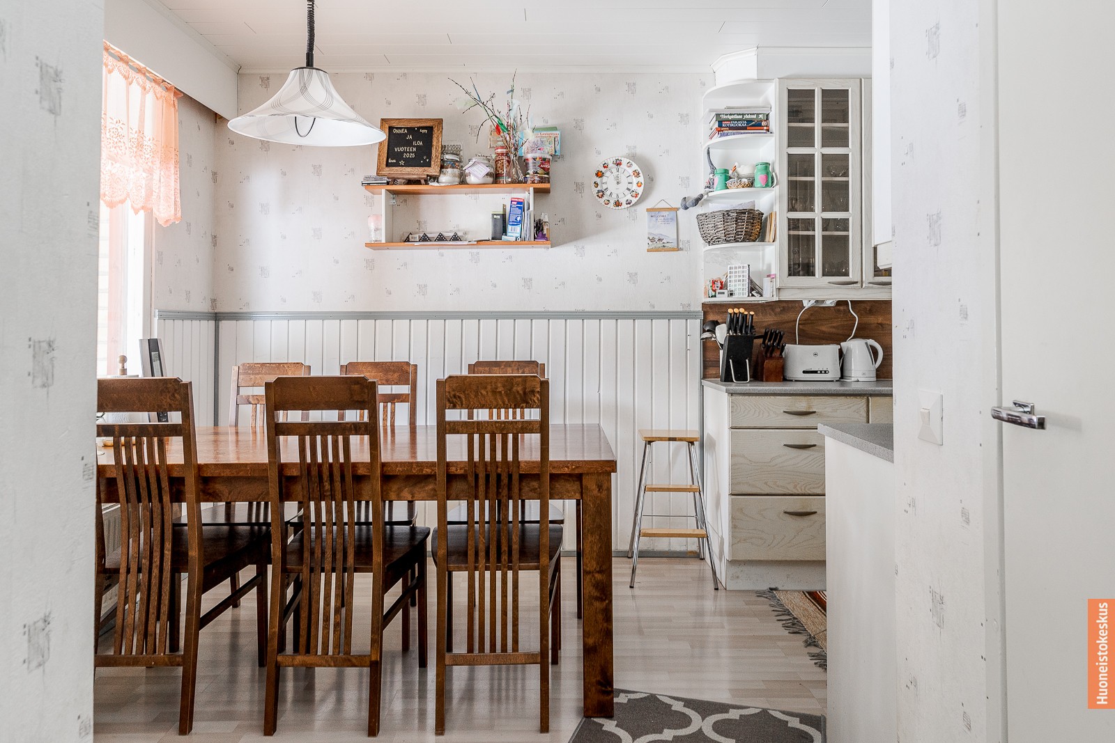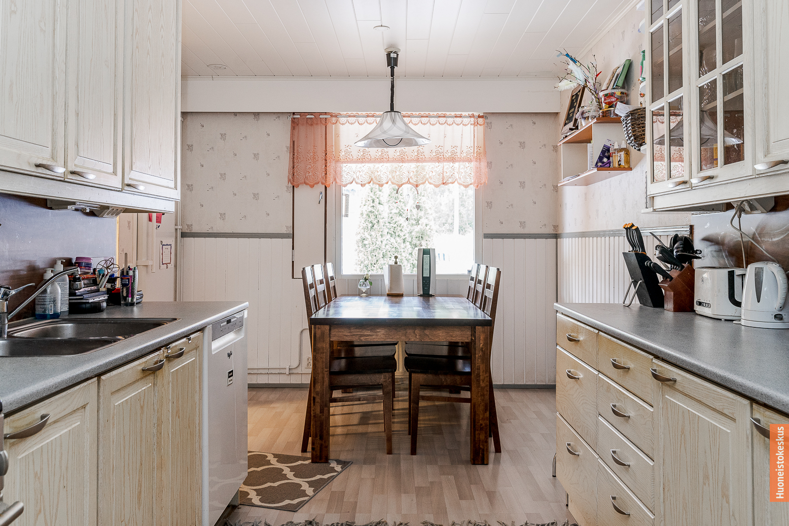| Keittiön kuvaus | Liesi (Keraaminen liesi), seinät (tapetti ja puolipaneeli), lattiat (laminaatti), jää-viileäkaappi, astianpesukone ja kiinteät valaisimet, liesituuletin / hormi |