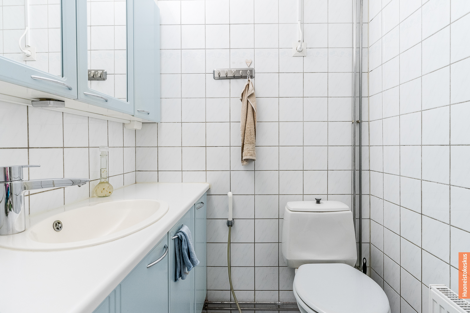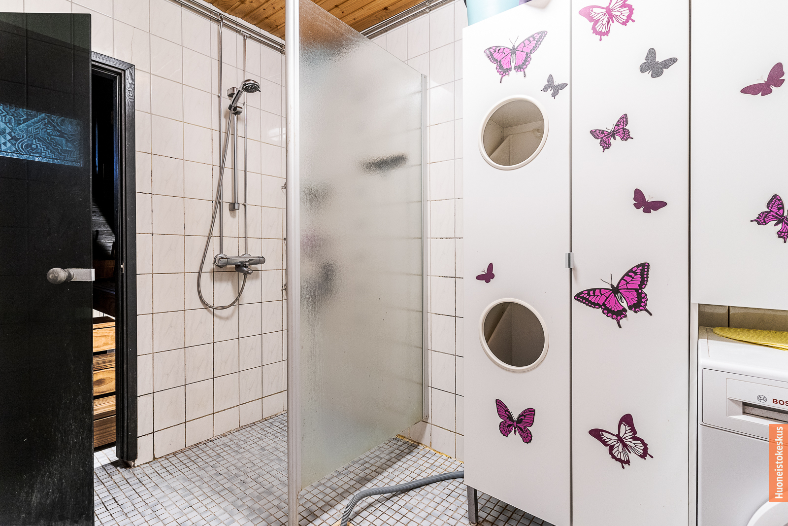 | Kylpyhuoneen kuvaus | Suihkuseinä, suihku ja pesukoneliitäntä, seinät (kaakeli), lattiat (laatta) |