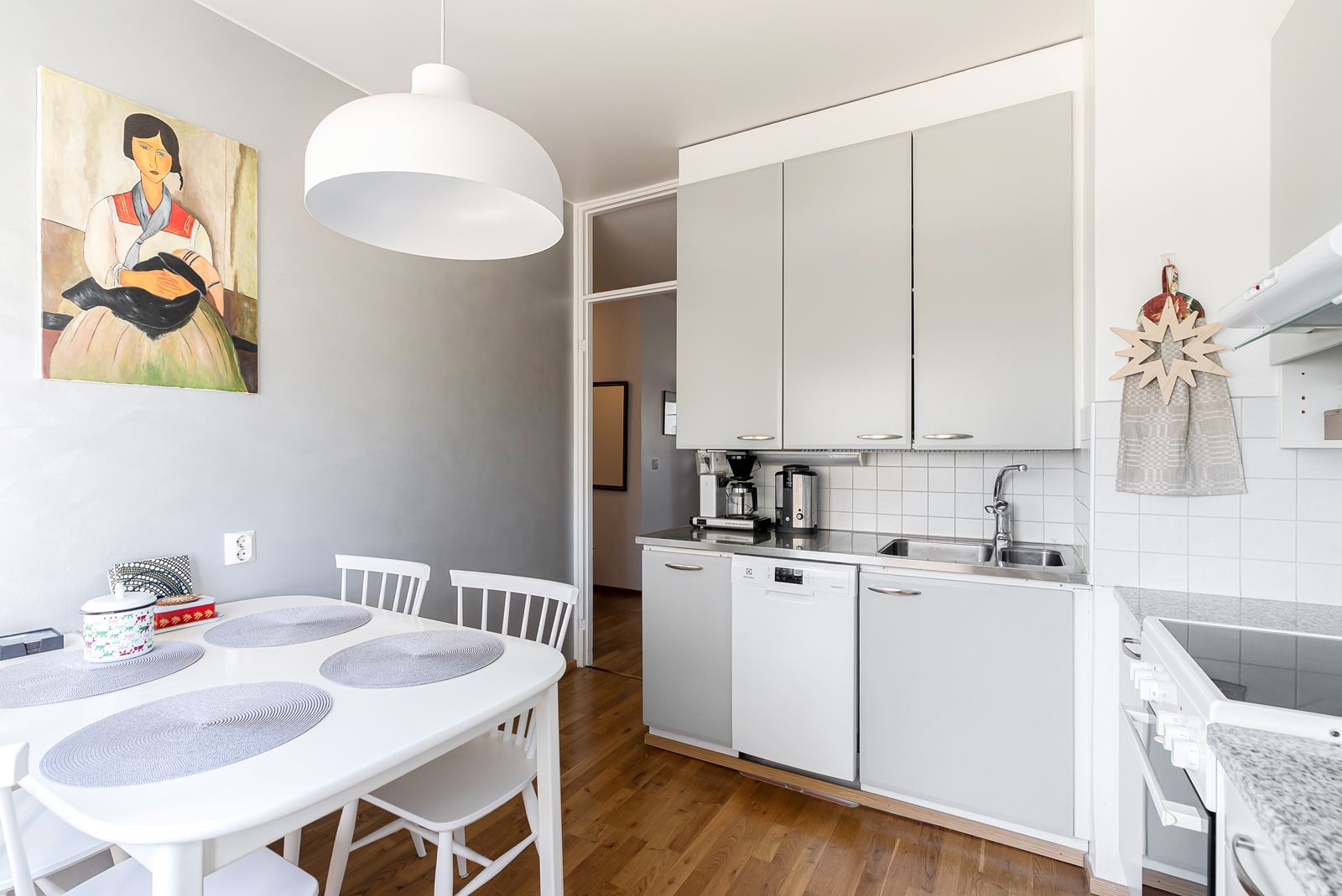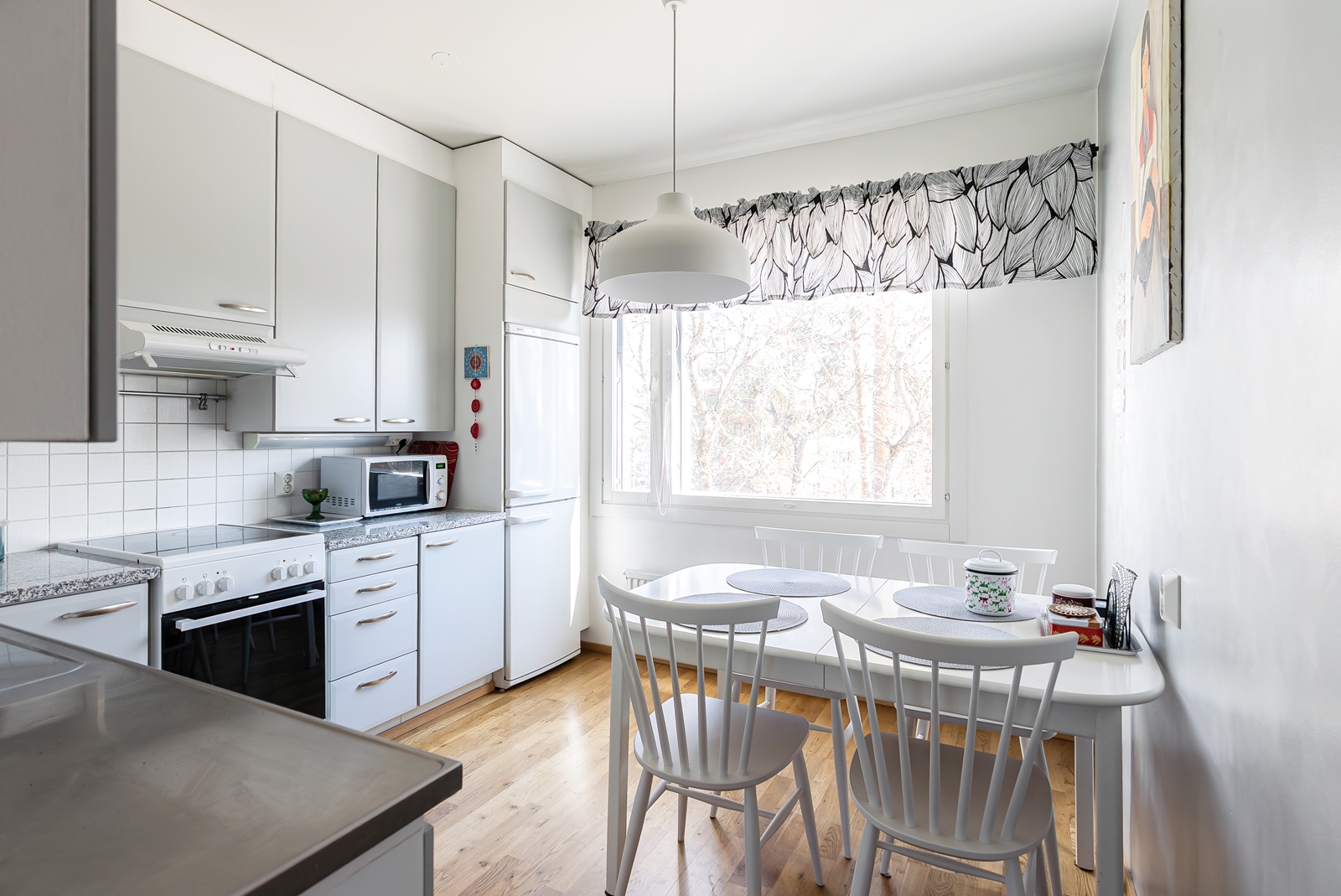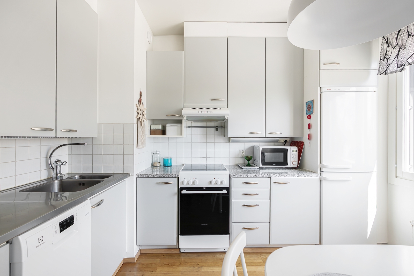 Liesi (Keraaminen liesi), lattiat (parketti), liesituuletin, jääkaappipakastin ja astianpesukone |