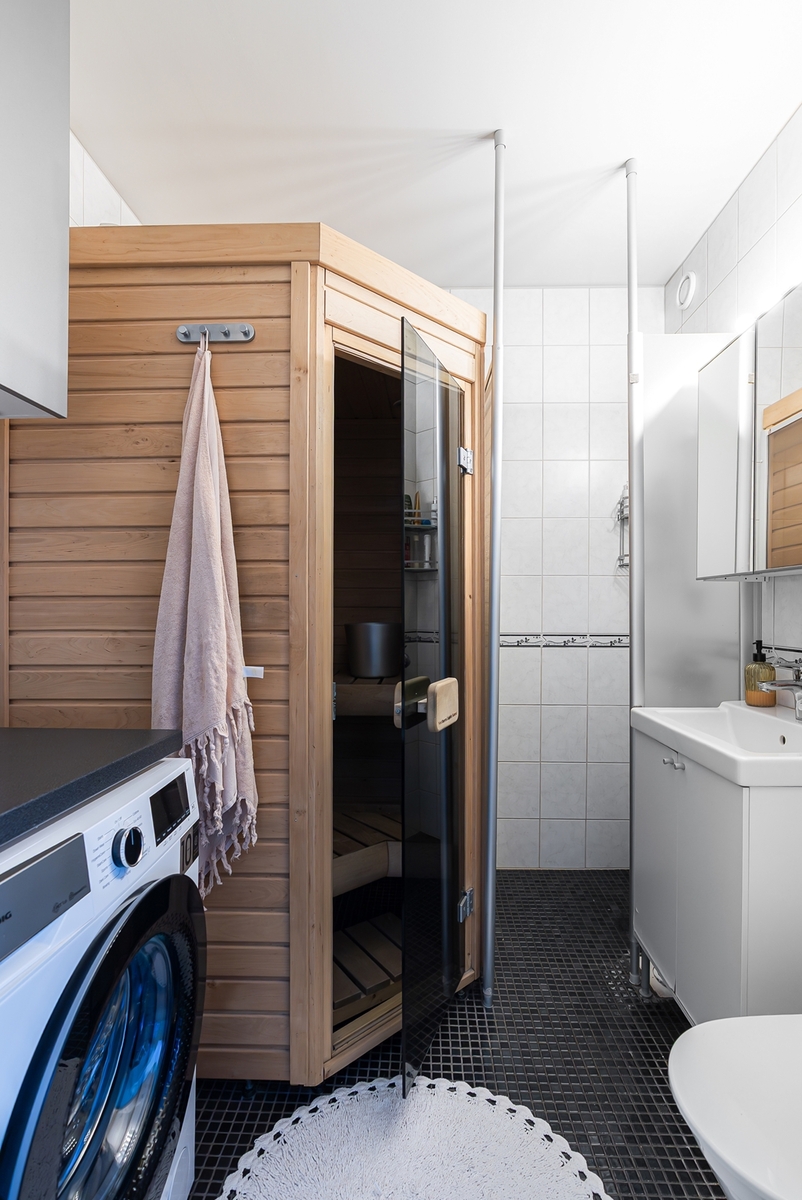 Isossa kylpyhuoneessa on hieno kalustesauna, (helposti myös purettavissa).