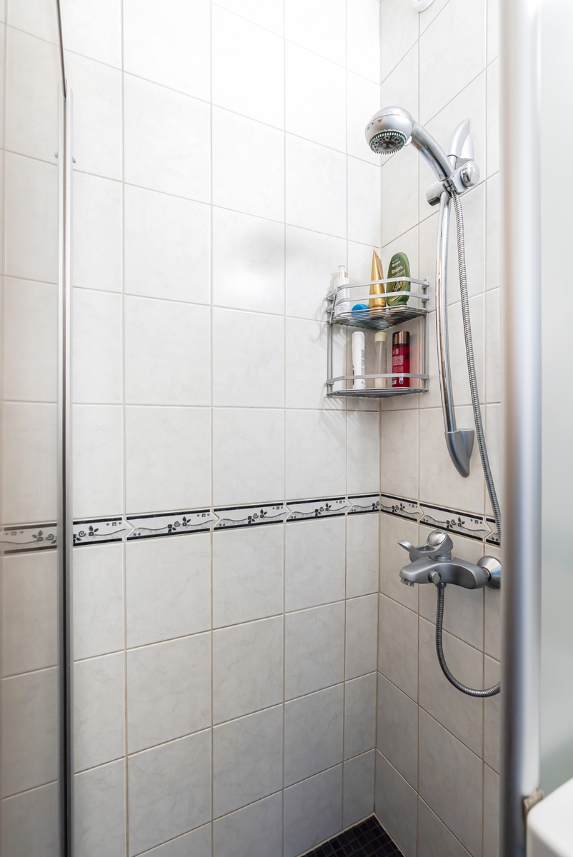 Suihku, lattialämmitys, wc-istuin, peilikaappi ja pesukoneliitäntä, seinät (kaakeli), lattiat (laatta) |
