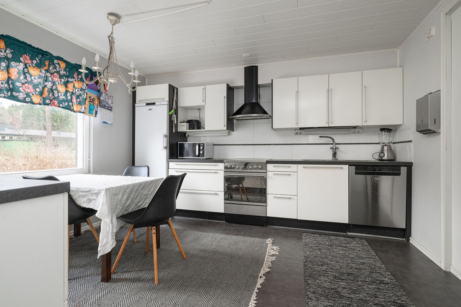 Liesi (Keraaminen liesi), työtasot (laminaatti), seinät (maali), lattiat (vinyyli), jääkaappi, astianpesukone, erillinen pakastin ja liesituuletin / hormi, kiinteät valaisimet |