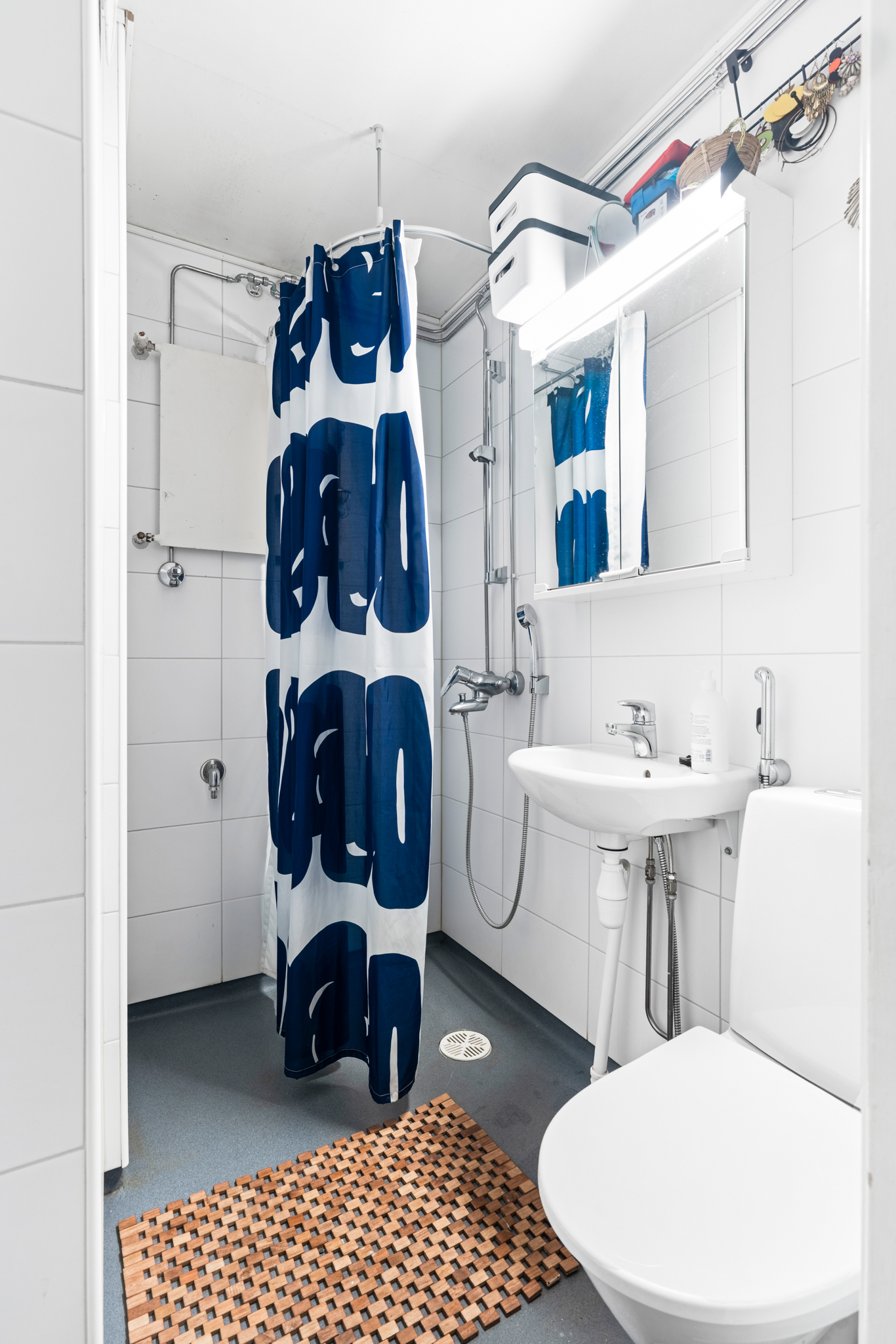 | Kylpyhuoneen kuvaus | WC-istuin, suihku, pesukoneliitäntä, bidee-suihku, pesuallas, peilikaappi ja allaskaappi, seinät (kaakeli), lattiat (muovimatto) |