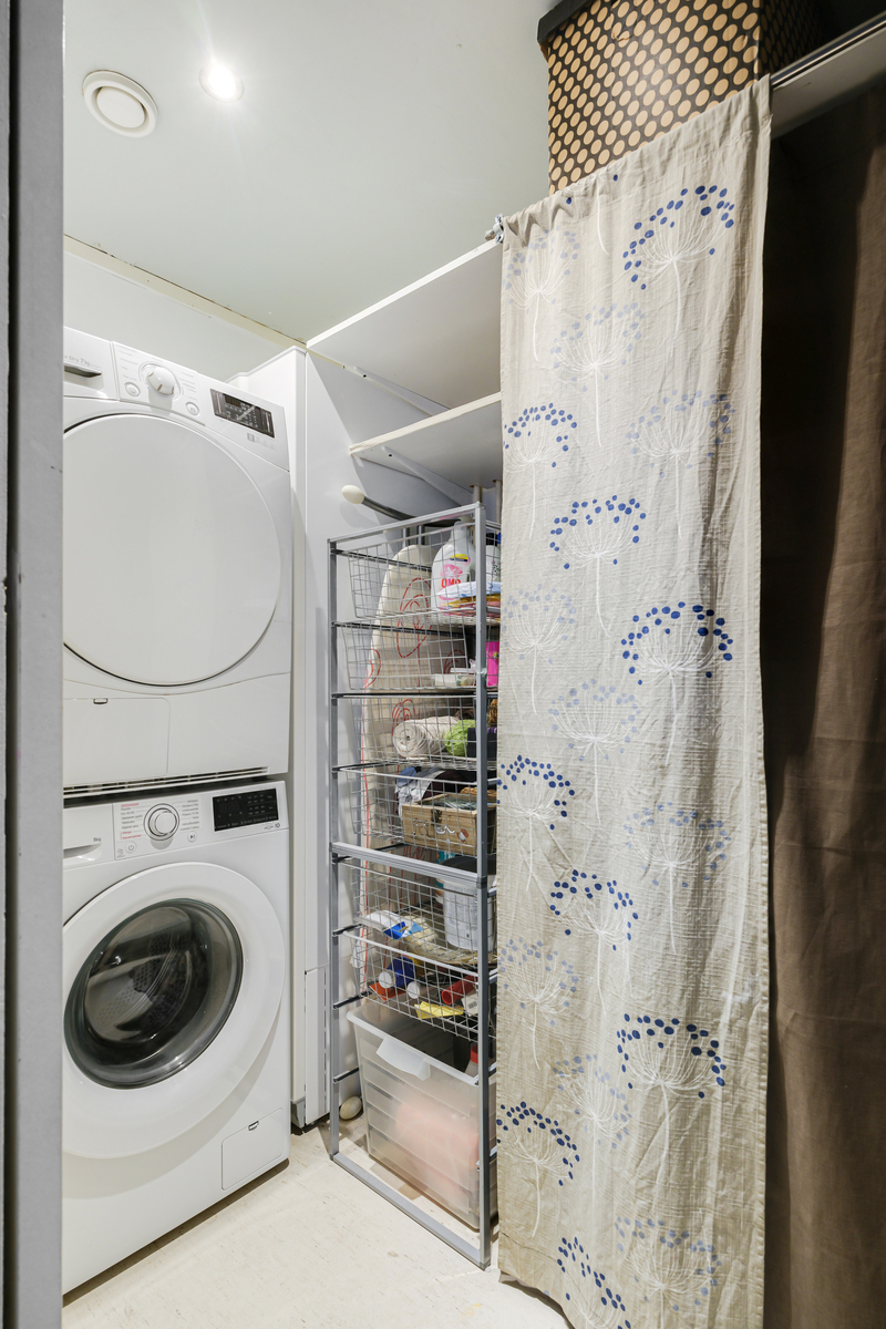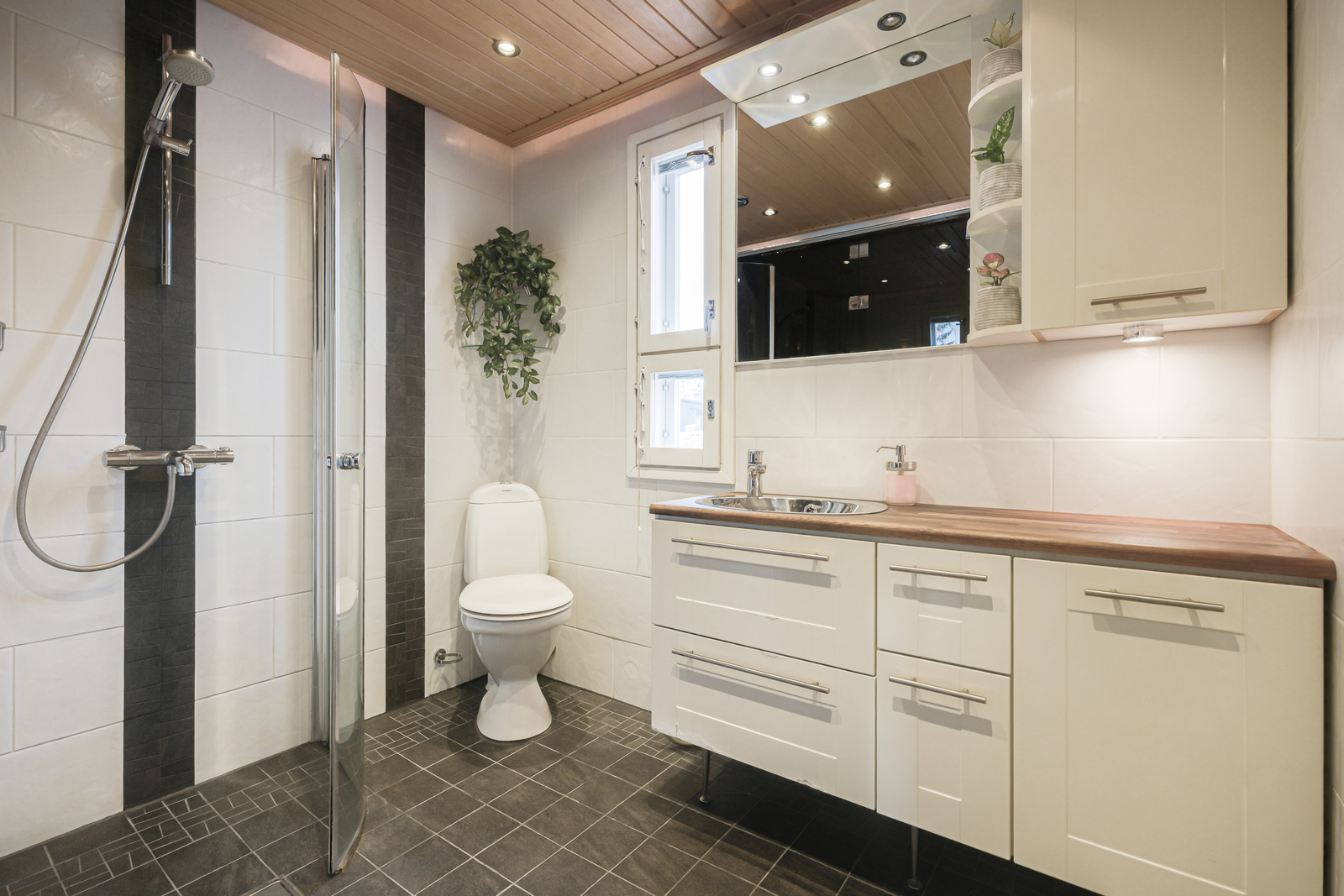 Erillinen laatoitettu wc. Pyykkihuolto hoituu näppärästi khh/varastotilassa.