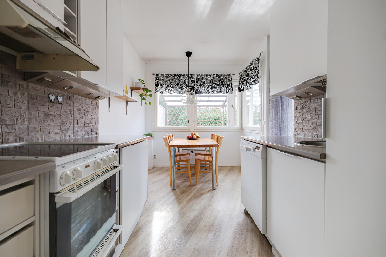 | Keittiön kuvaus | Liesi (Keraaminen liesi), lattiat (vinyyli), jenkkikaappi, astianpesukone, liesituuletin ja kiinteät valaisimet, Keittiön vinyylilattia asennettu v. 2018. Keittiön kaapistojen ovet uusittu 8/2024. |