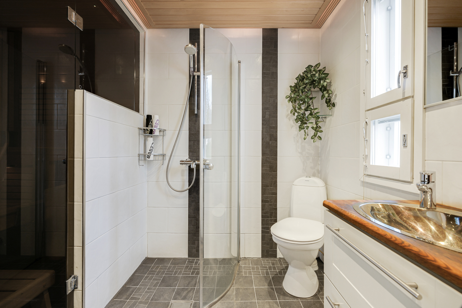 Tyylikäs kylpyhuone ja upea sauna kutsuvat viihtymään.