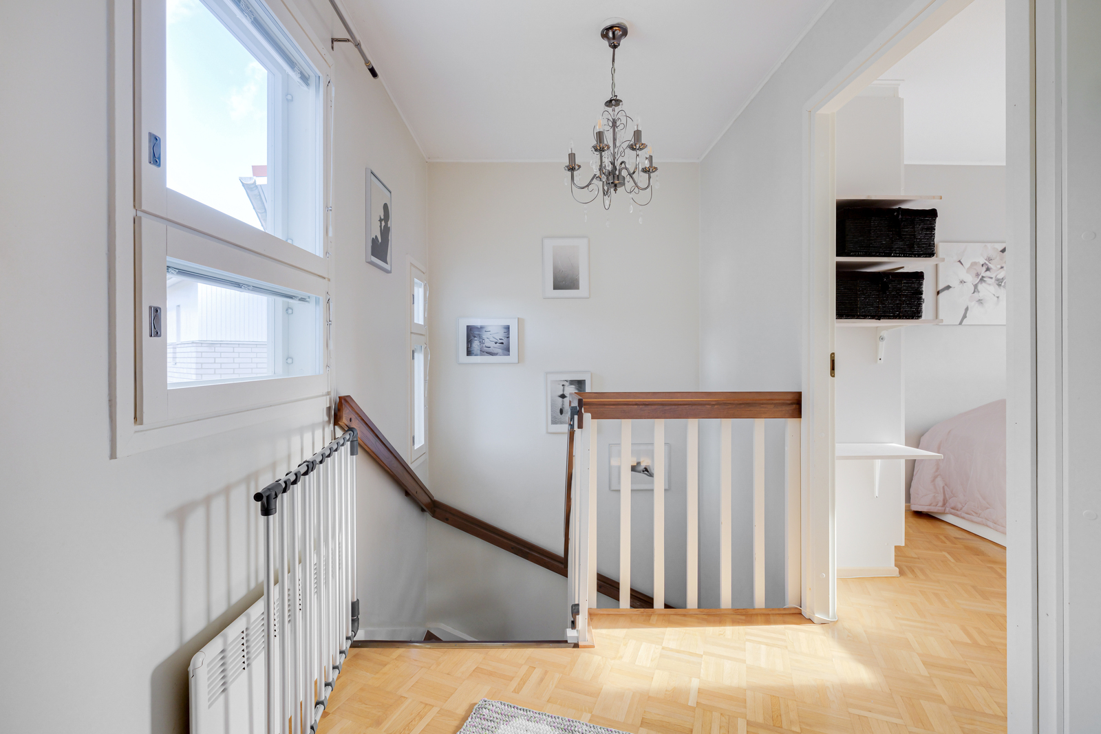 Yläkerrassa on kaksi makuuhuonetta. Suurempi makuuhuone, jonka yhteydessä on parveke, on tarvittaessa jaettavissa kahdeksi tilaksi.