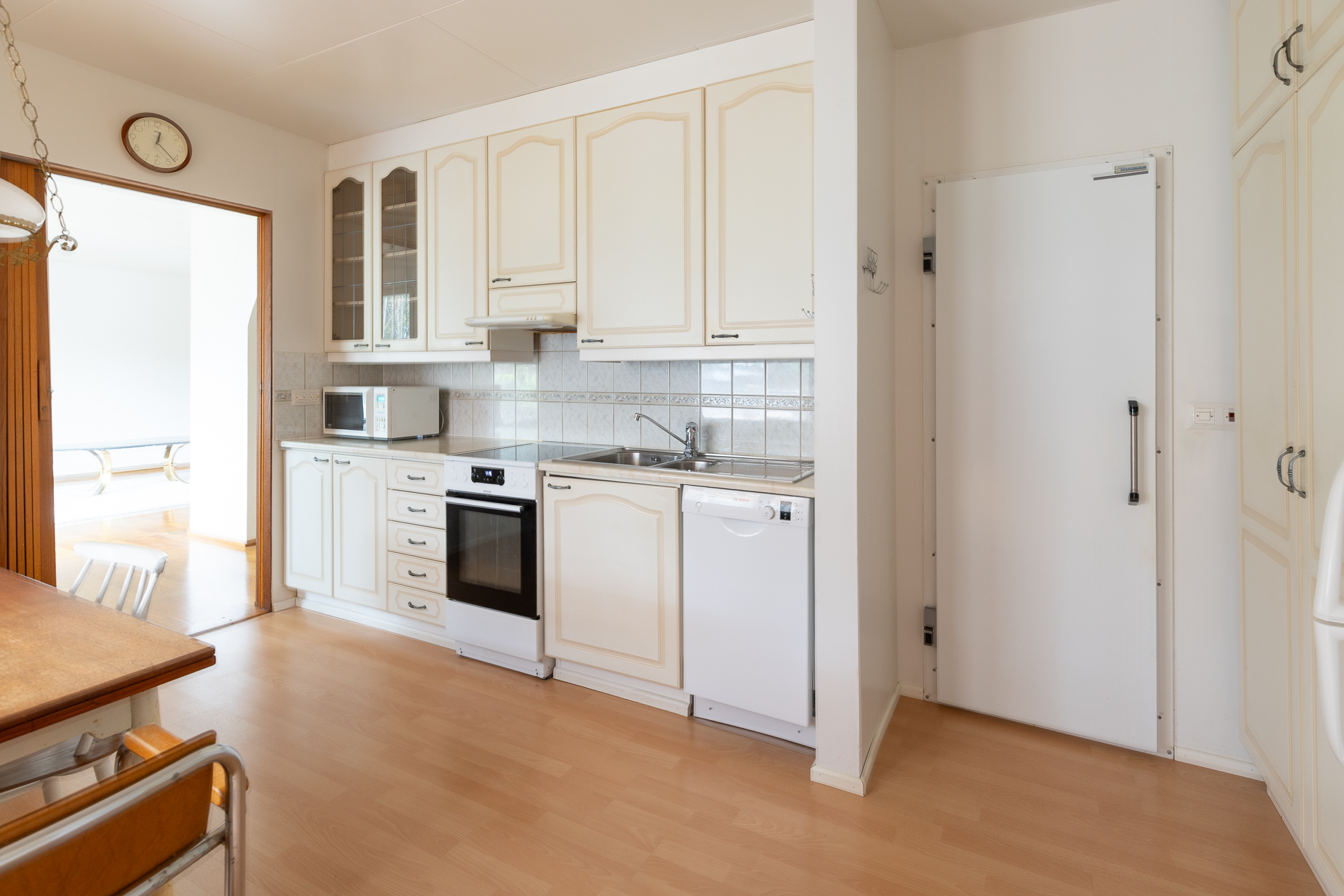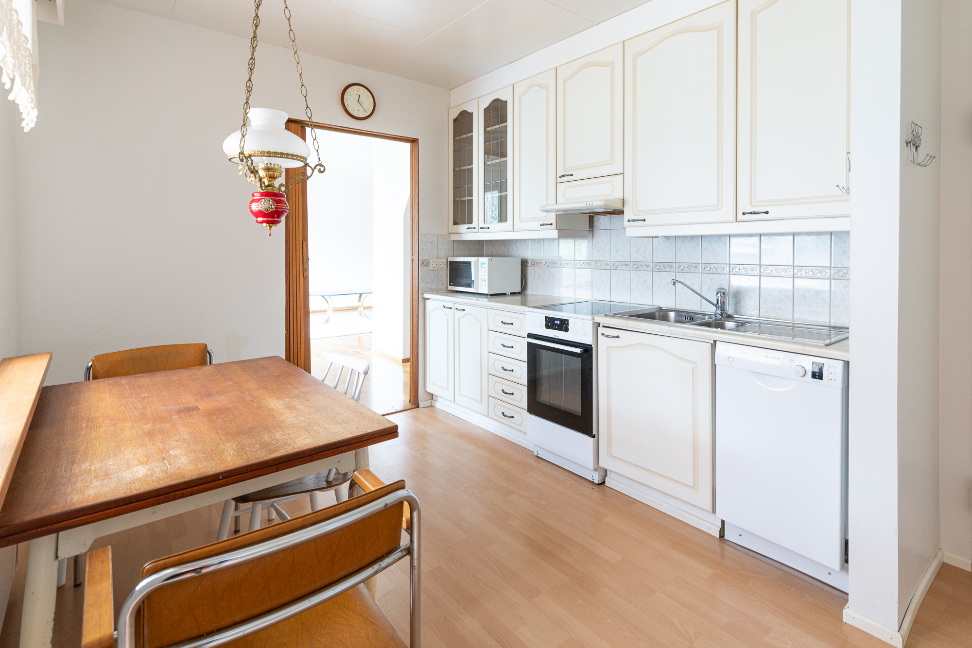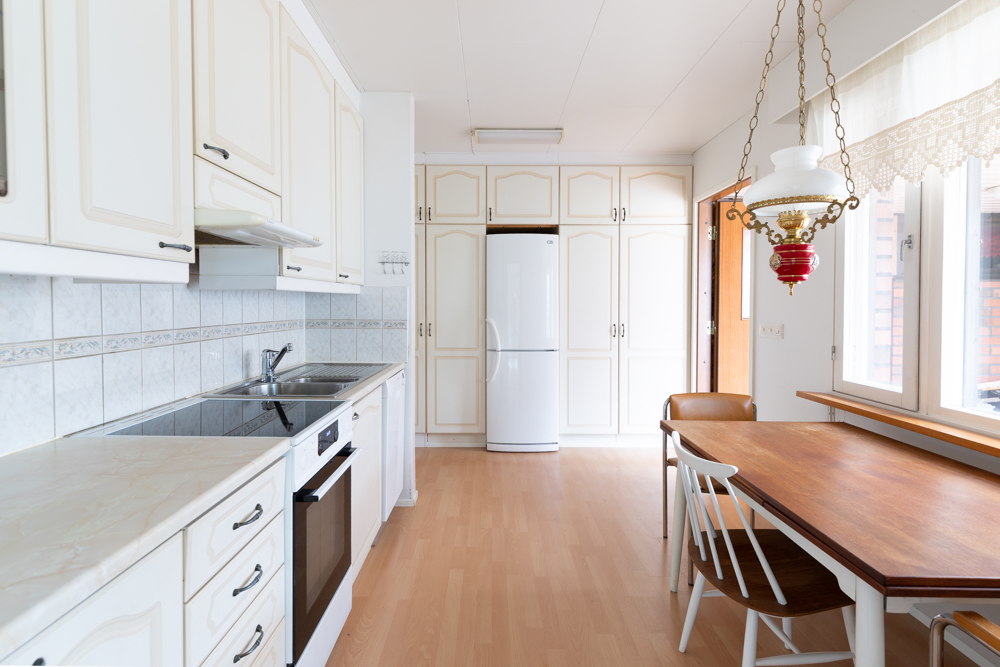 Liesi (Keraaminen liesi), työtasot (laminaatti), seinät (maali), lattiat (laminaatti), liesi (2017), jääkaappipakastin, liesituuletin, astianpesukone ja kylmiö/ei testattu |