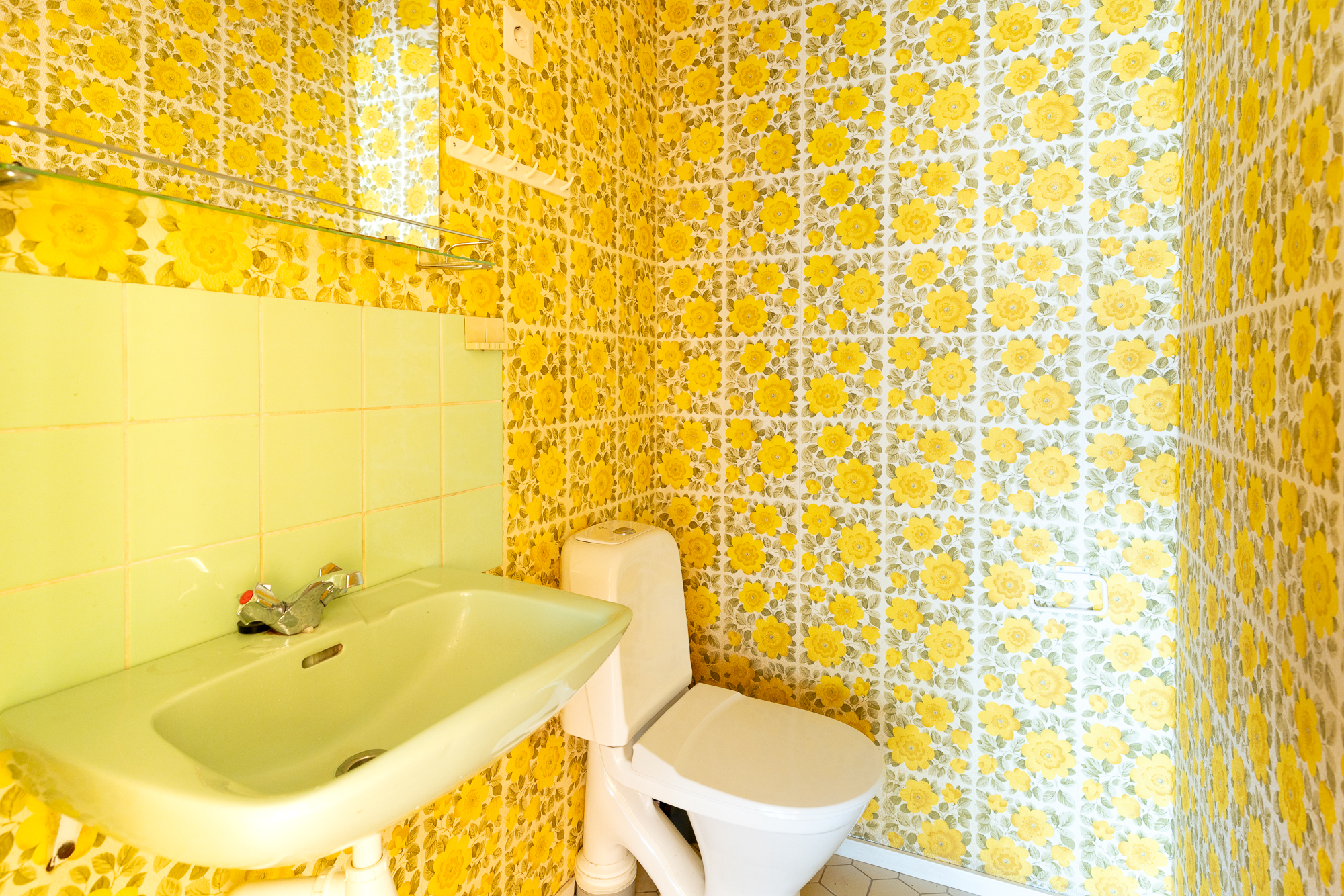 Lukumäärä: 2, WC-istuin, allaskaappi ja peili, seinät (Tapetti ja kaakeli), lattiat (Laatta ja Toisessa WC:ssä allaskaappi) |