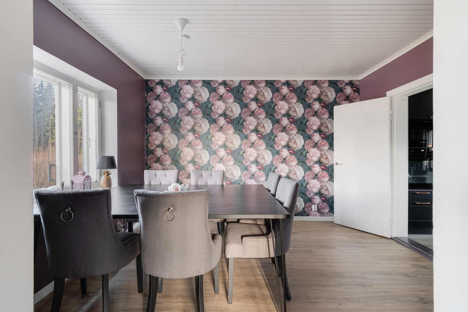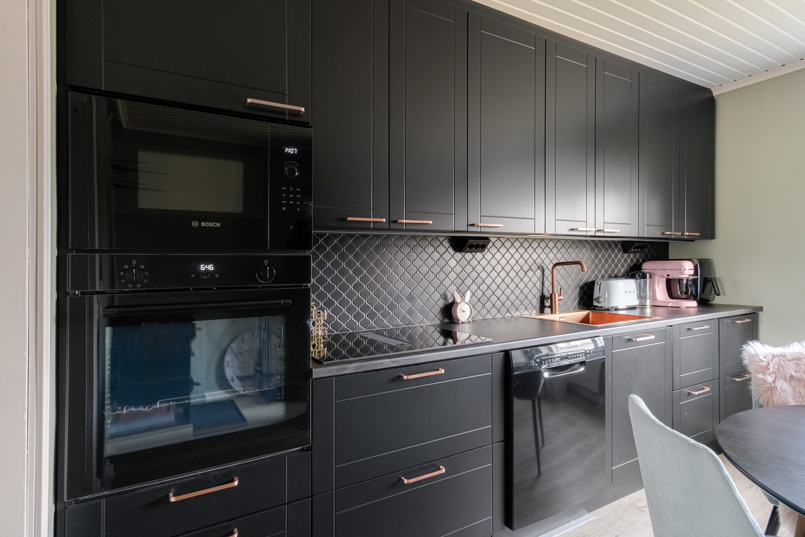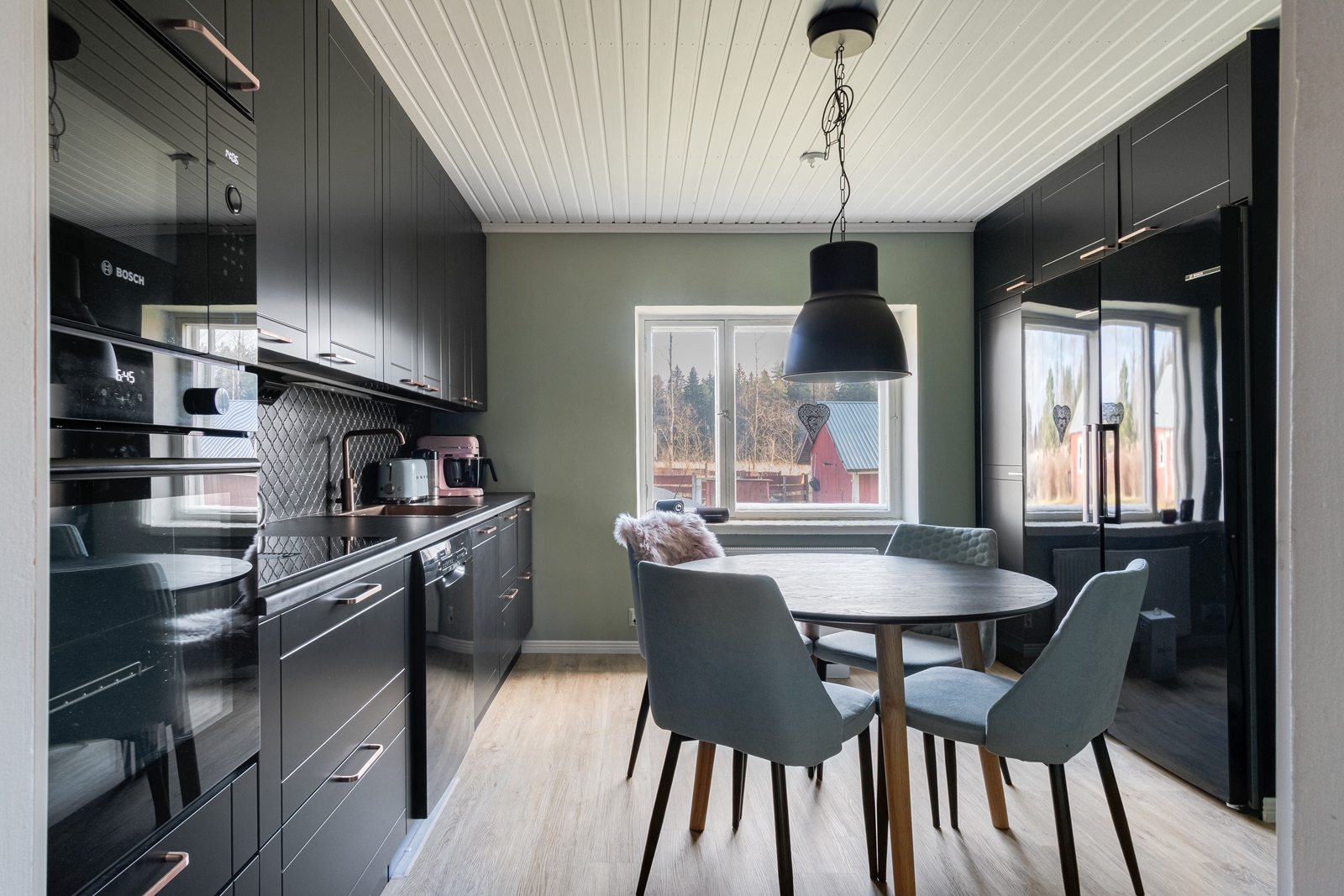 | Keittiön kuvaus | Liesi (Induktioliesi), työtasot (laminaatti), seinät (laatta ja maali), lattiat (vinyyli), jääkaappi, erillinen pakastin, astianpesukone, liesituuletin, mikroaaltouuni, erillisuuni, liesi ja porinmaija |