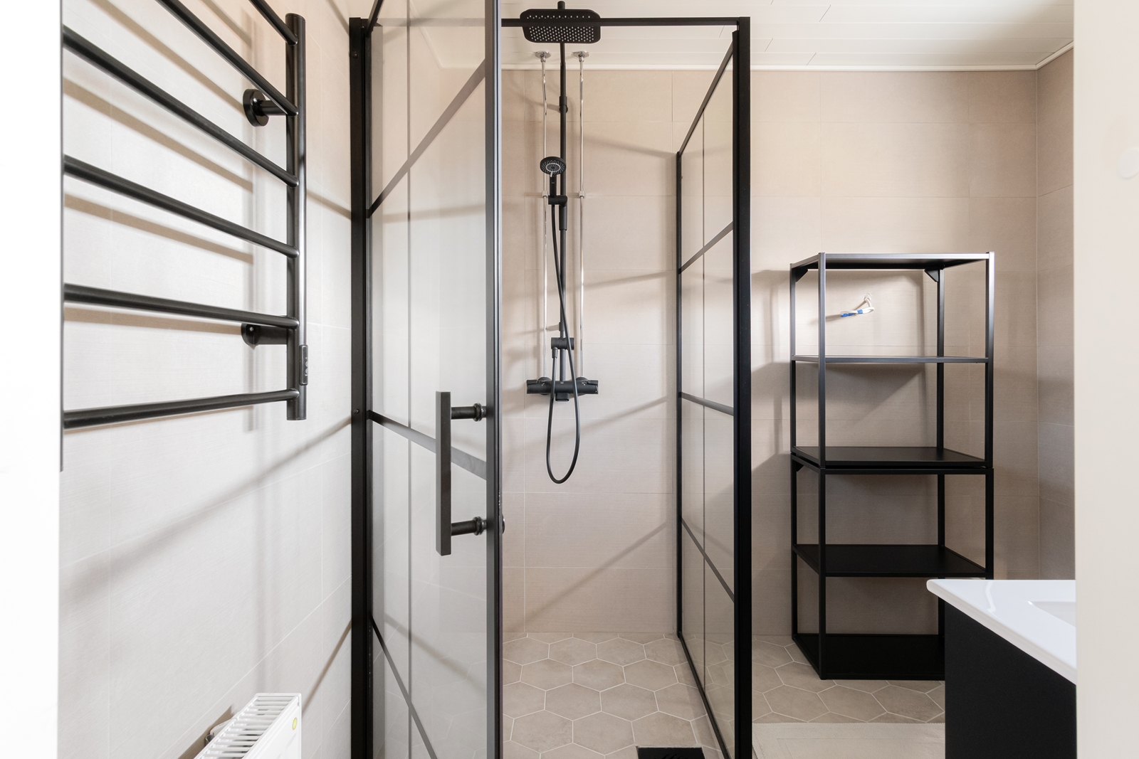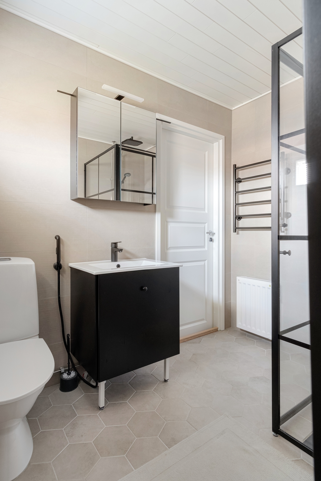 | Kylpyhuoneen kuvaus | WC-istuin, pesukoneliitäntä, suihkuseinä, lattialämmitys, bidee-suihku, suihku, allaskaappi, peili ja pesuallas, seinät (kaakeli), lattiat (laatta) |