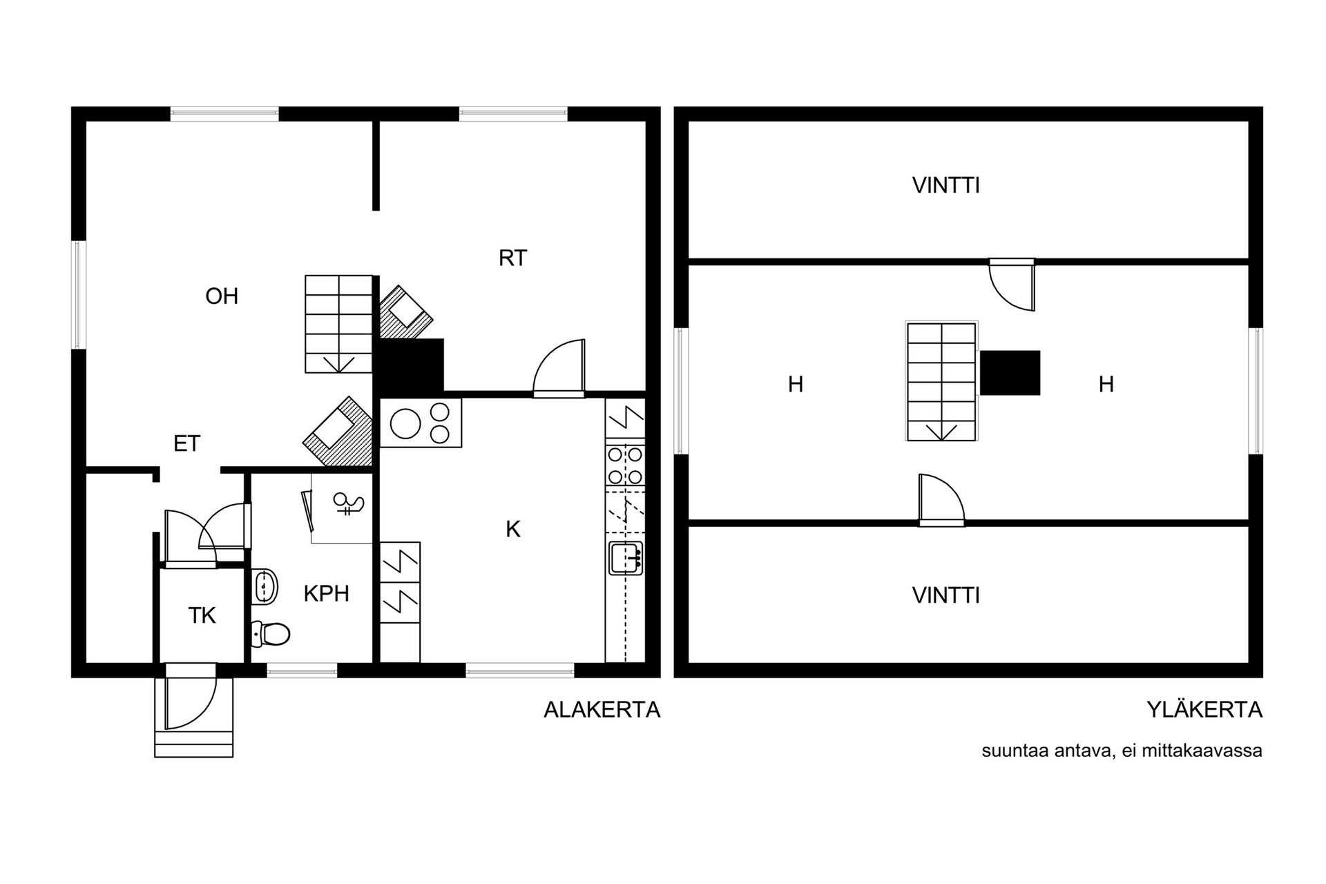 | Muut huoneet ja tilat | Yläkerta avointa tilaa, jonka molemmin puolin kylmää, ovellista ullakkosäilytystilaa. |