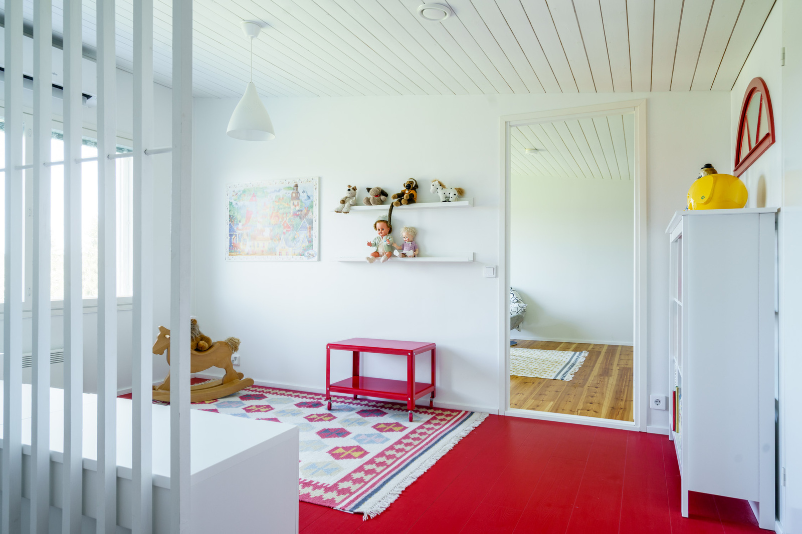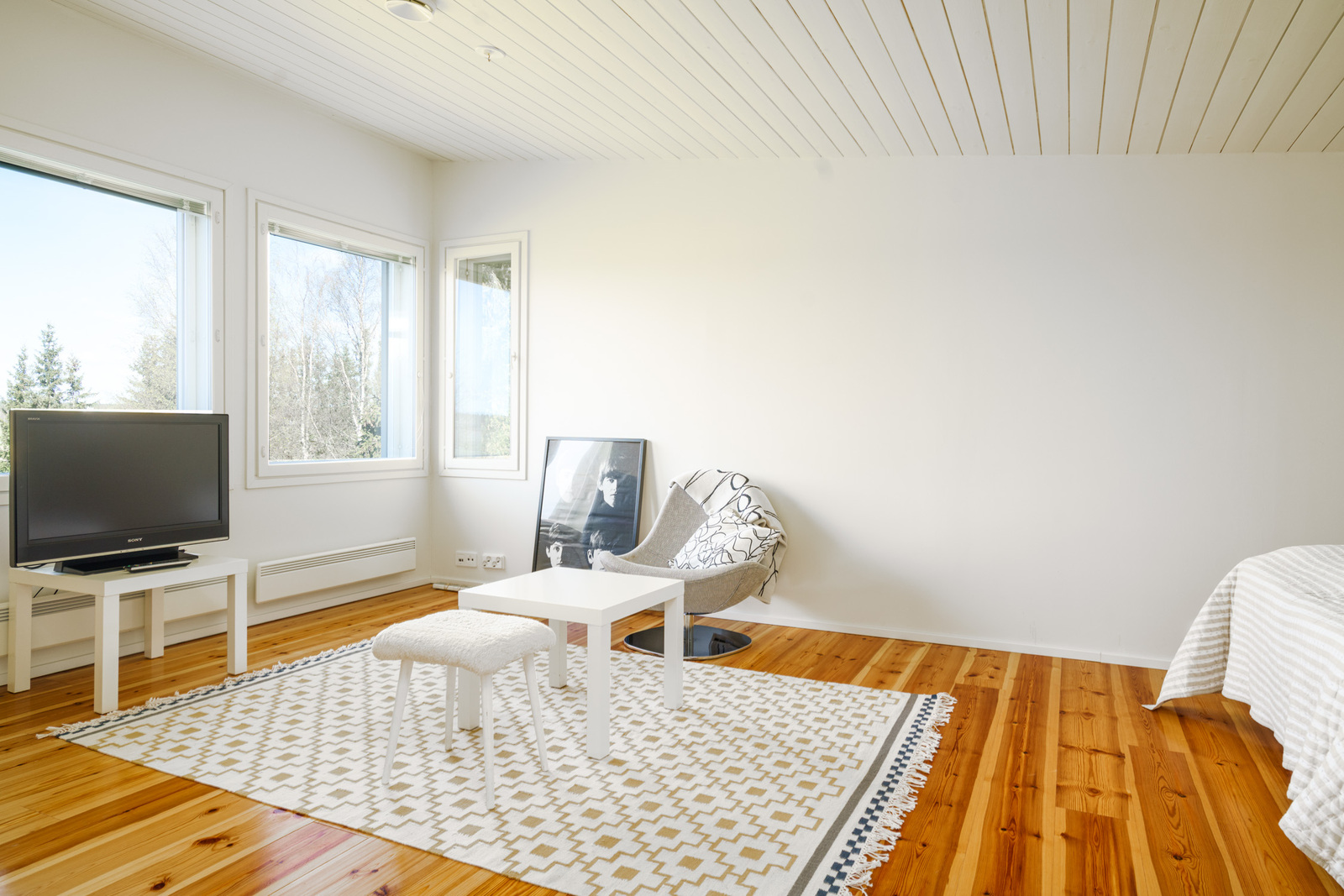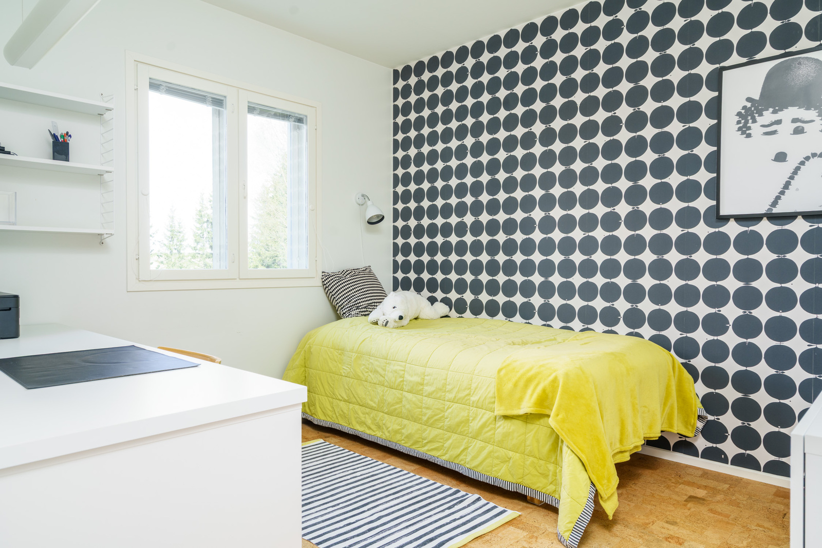 | Makuuhuoneen kuvaus | Lukumäärä: 4, seinät (tapetti), lattiat (parketti ja korkki), Alakerran makuuhuoneissa lattiat korkkiparkettia, yläkerrassa mäntyparkettia |