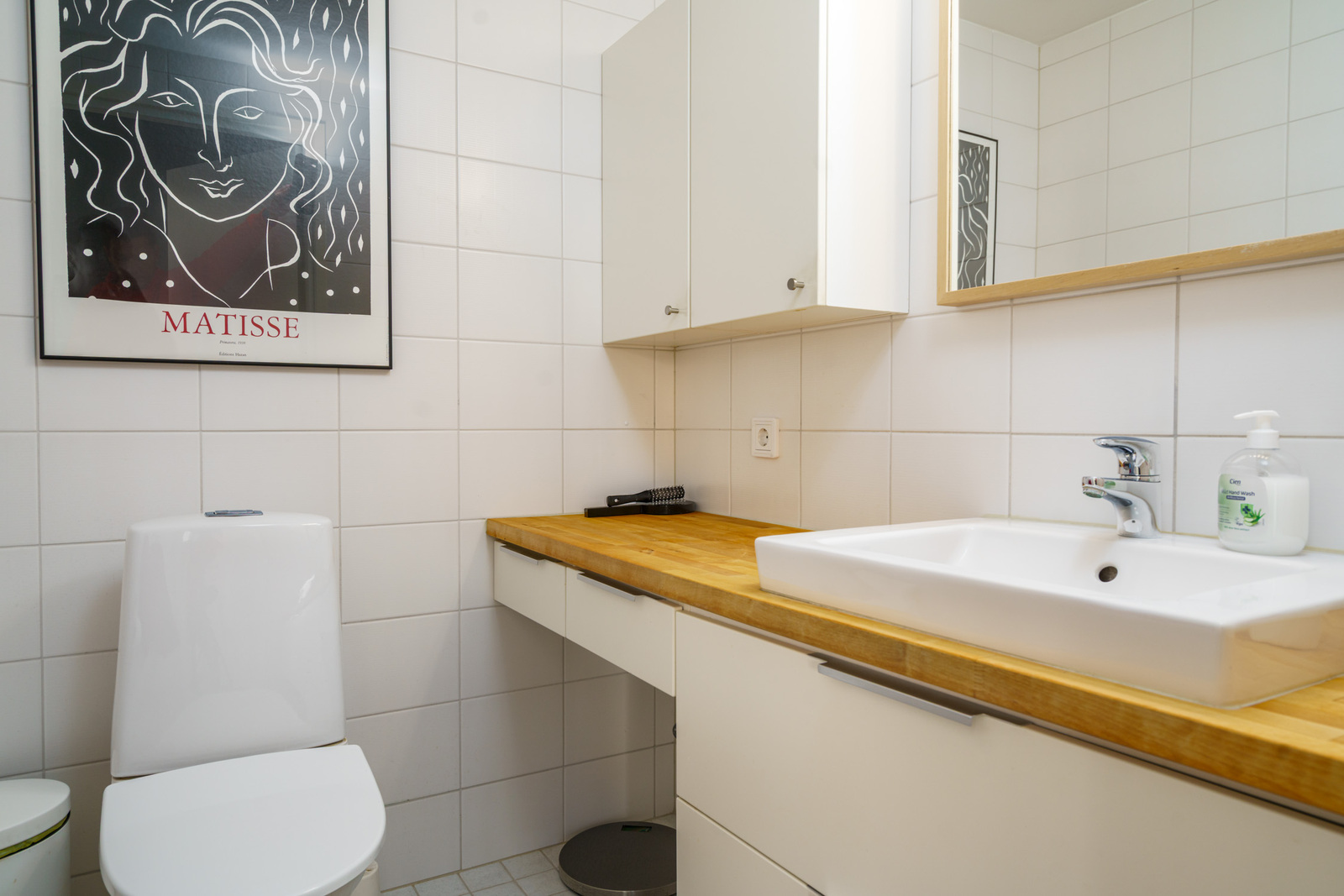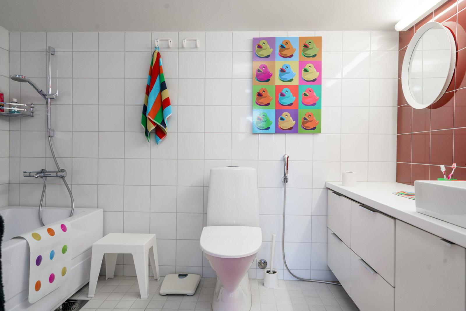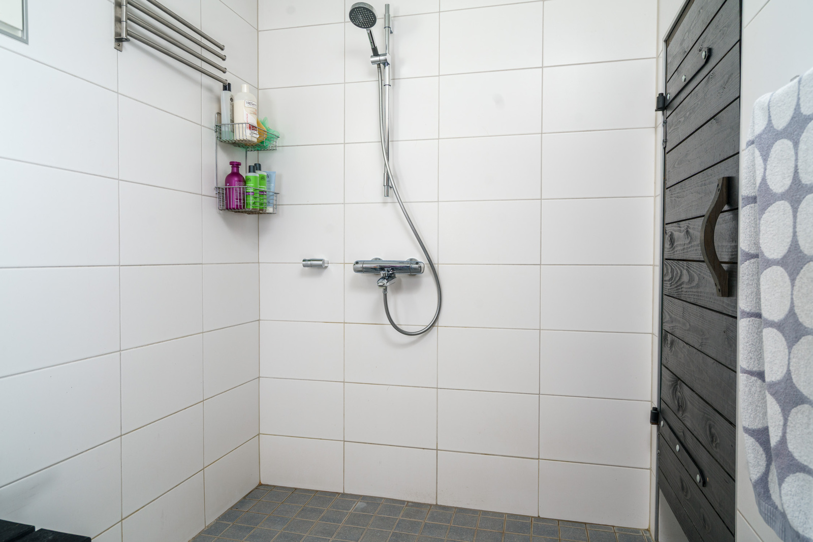 | Kylpyhuoneen kuvaus | Suihku, seinät (kaakeli), lattiat (laatta), Myös yläkerran wc:ssä kylpyamme / suihku |