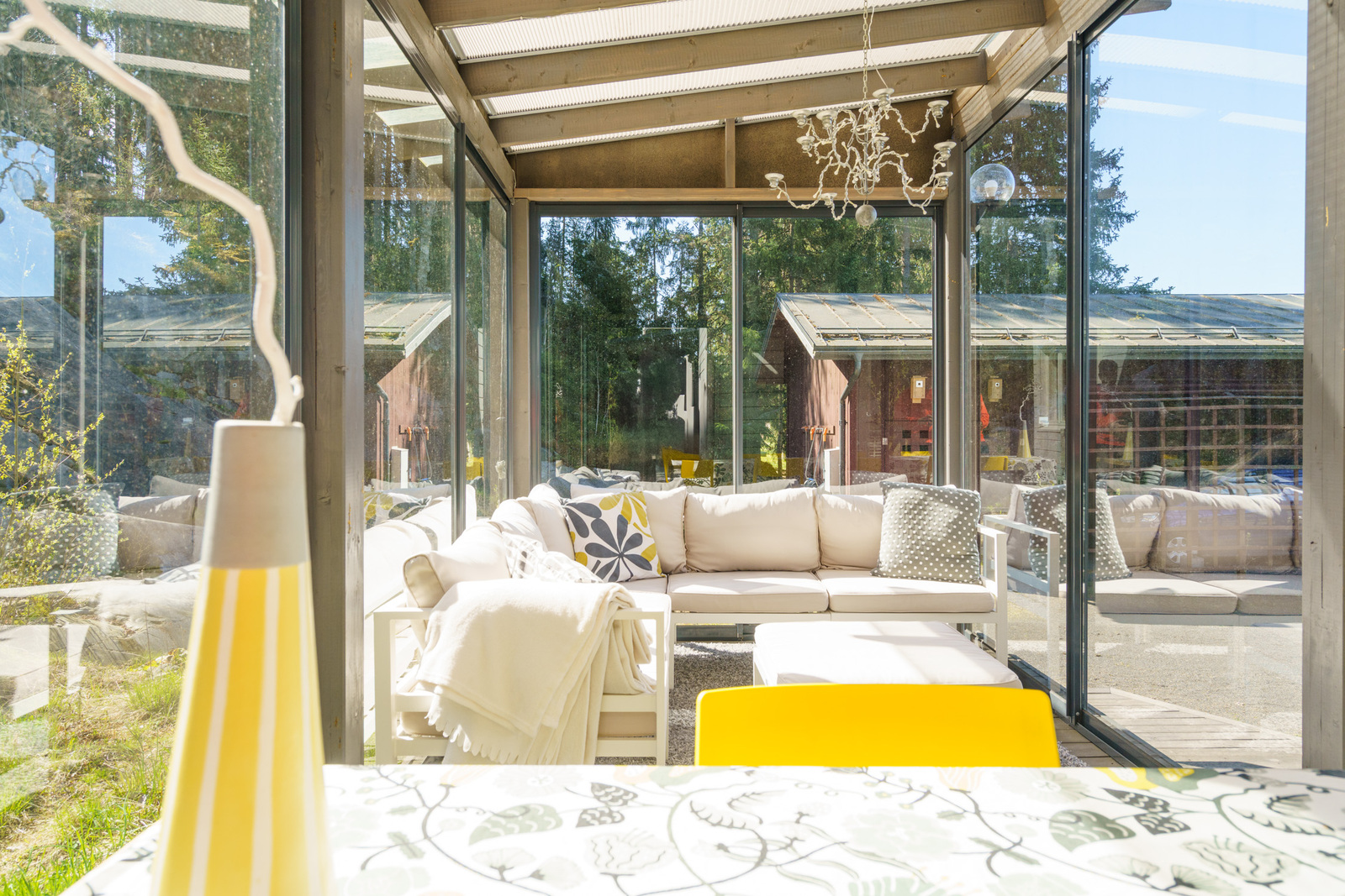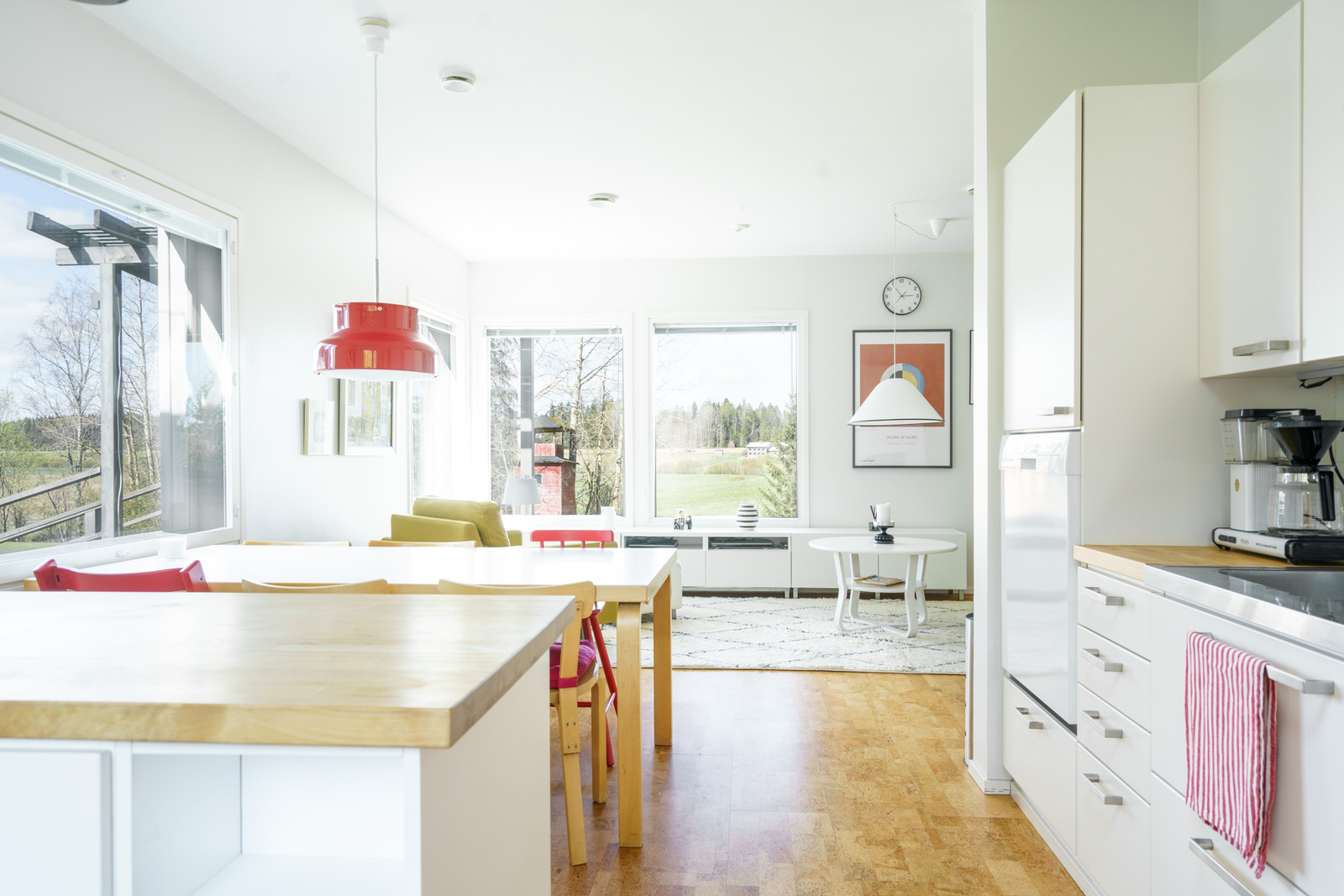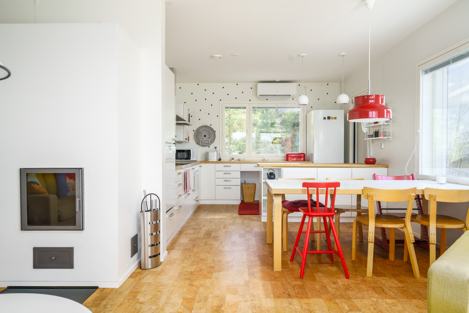 Avarassa olohuoneessa on varaava takka, joka tuo lämpöä ja tunnelmaa. Toimiva keittiö on varusteltu laadukkailla kodinkoneilla, ja keittiöstä on suora käynti lasitetulle ja katetulle terassille.