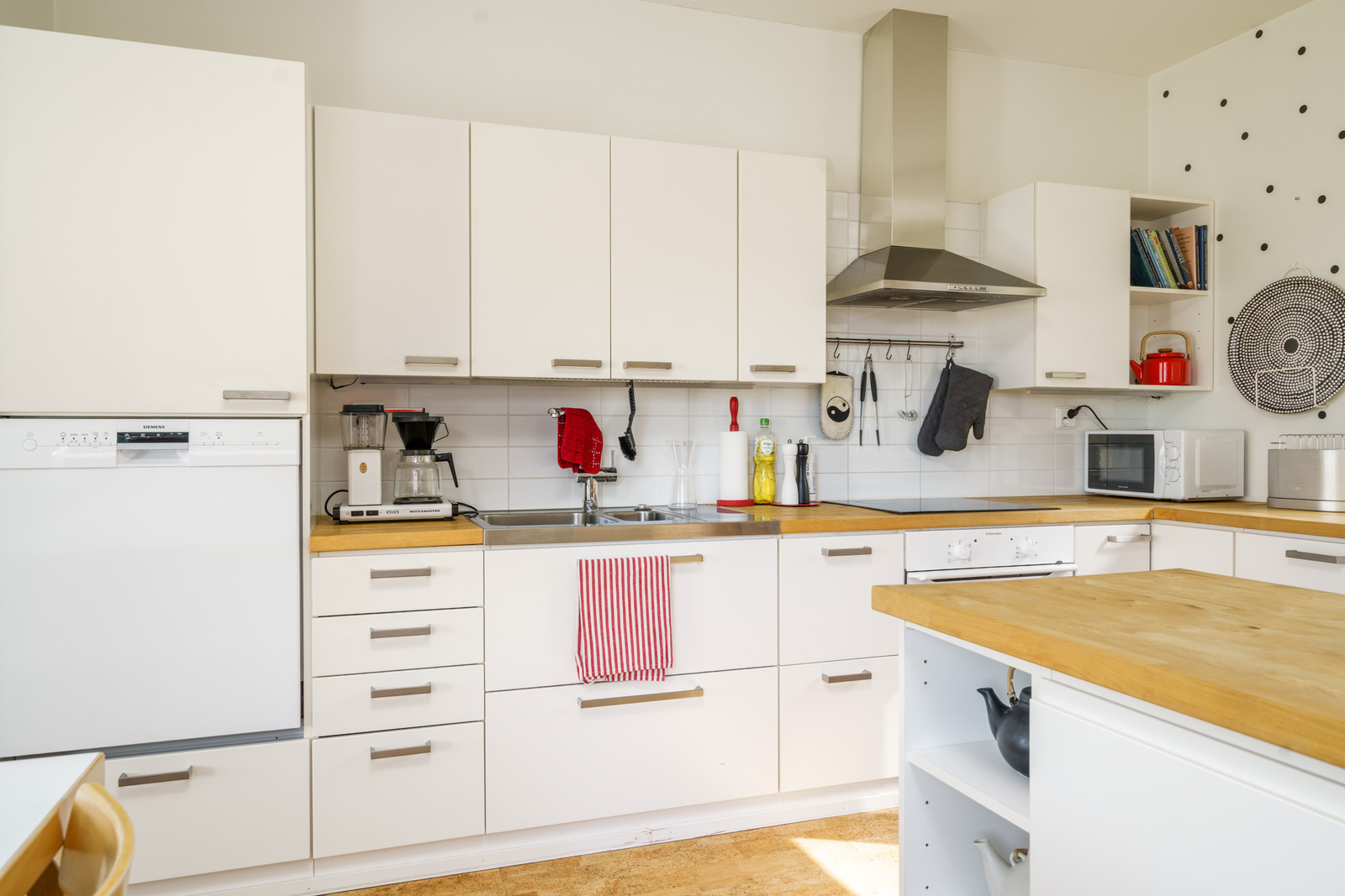 | Keittiön kuvaus | Liesi (Induktioliesi), työtasot (puu), seinät (tapetti ja osalaatoitus), lattiat (korkki), astianpesukone, jääkaappipakastin, liesituuletin ja liesi |
