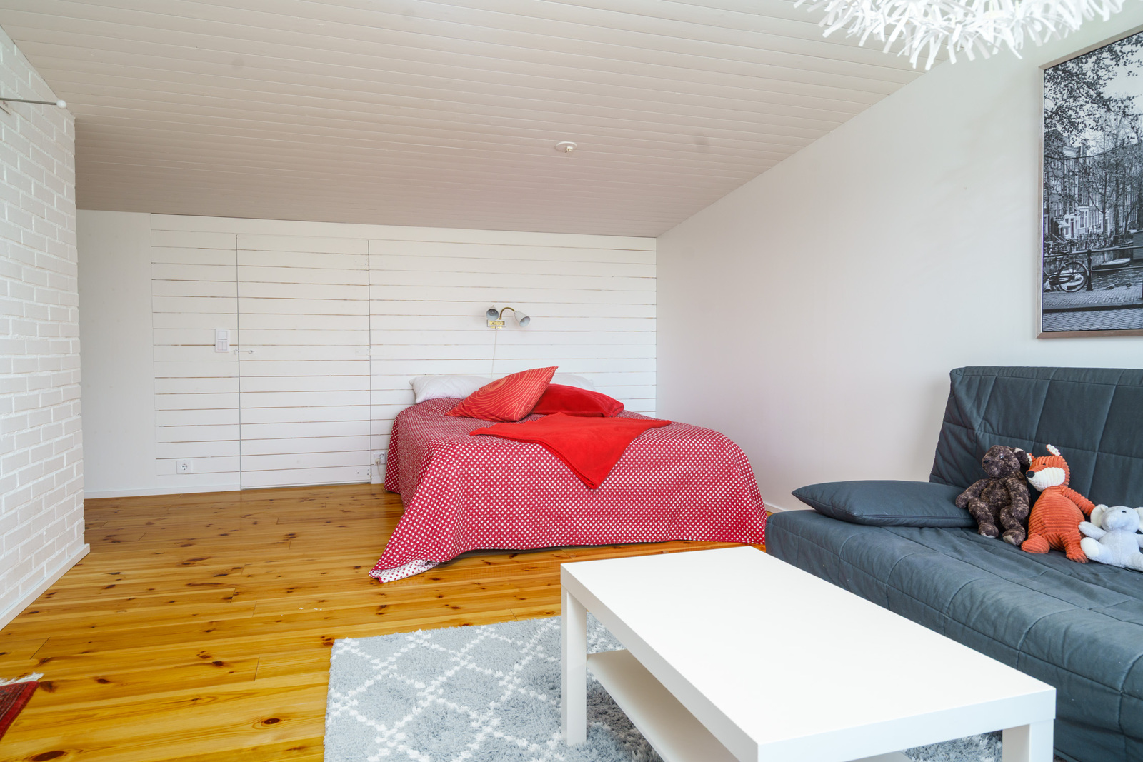 Yläkerrassa kylpyhuone / wc, aula, lämmin ullakkovarasto, sekä kaksi isoa makuuhuonetta, joista toisessa “mini keittiö”