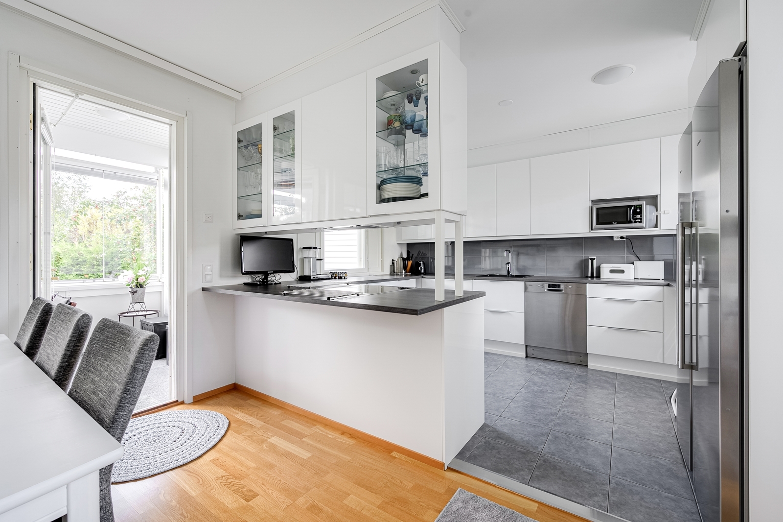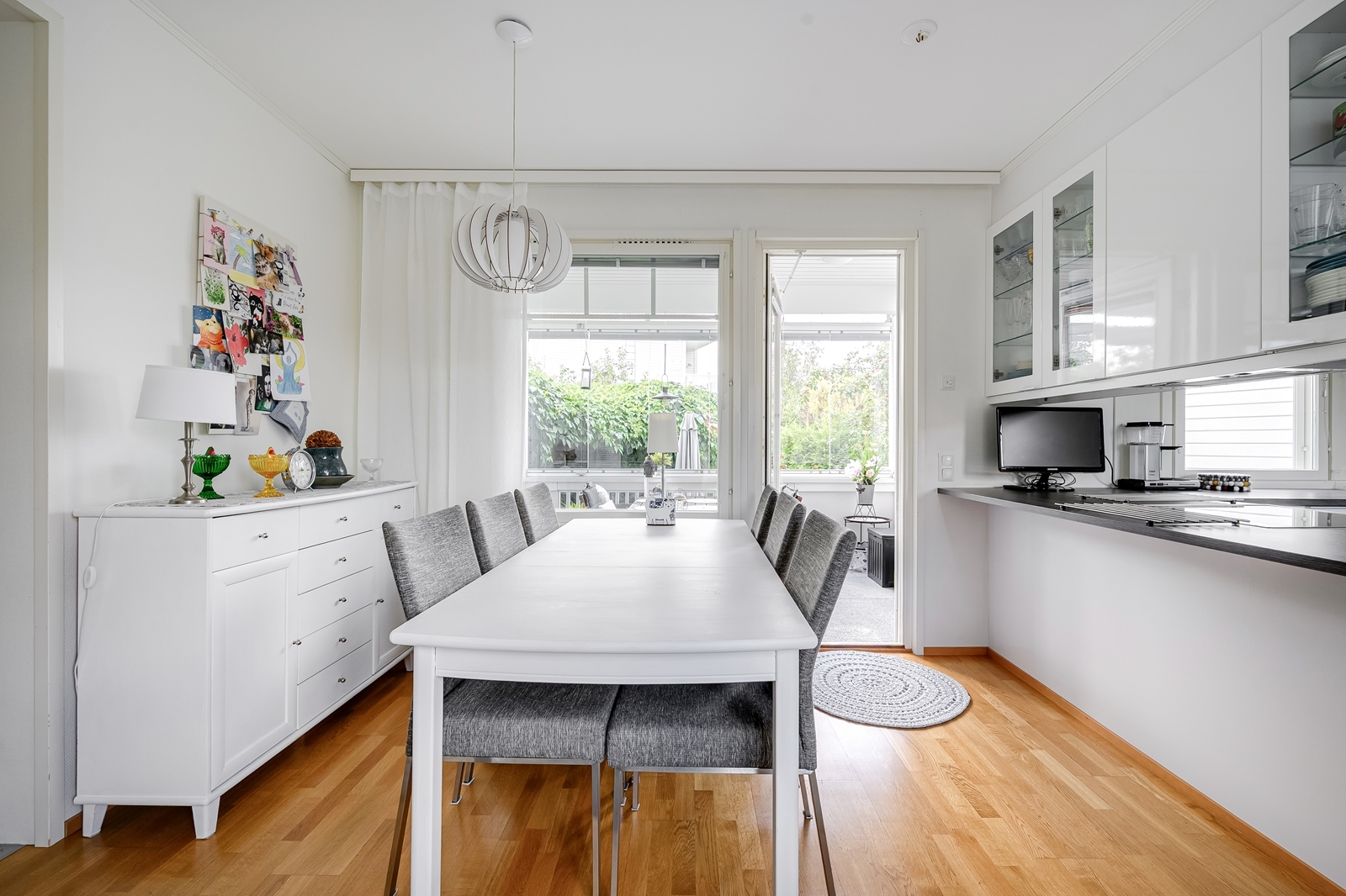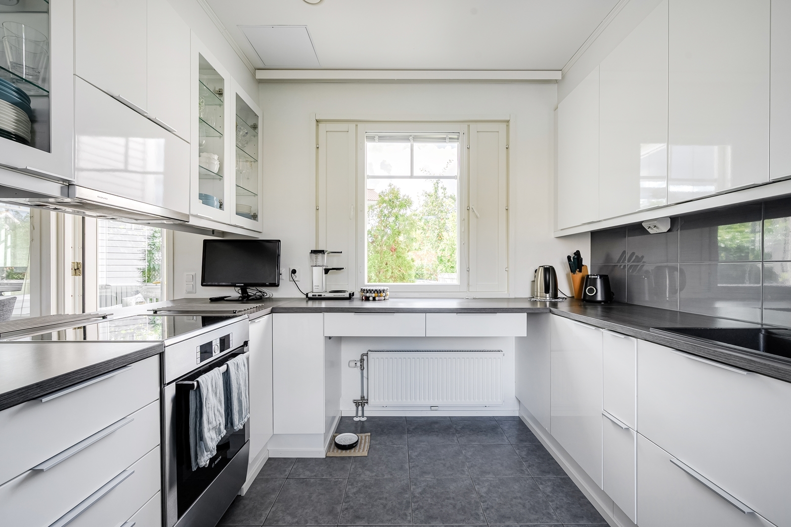 Liesi (Induktioliesi ja erillisuuni), seinät (maali), lattiat (laatta ja parketti), erillisuuni, erillinen pakastin, astianpesukone, jääkaappi, liesi ja liesituuletin / hormi, kiinteät valaisimet |