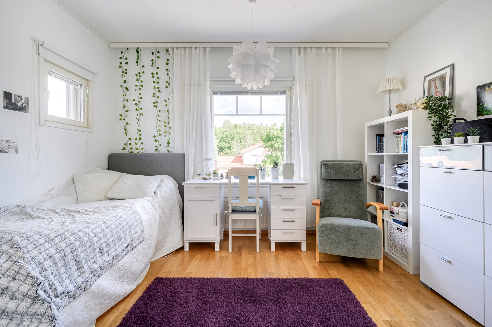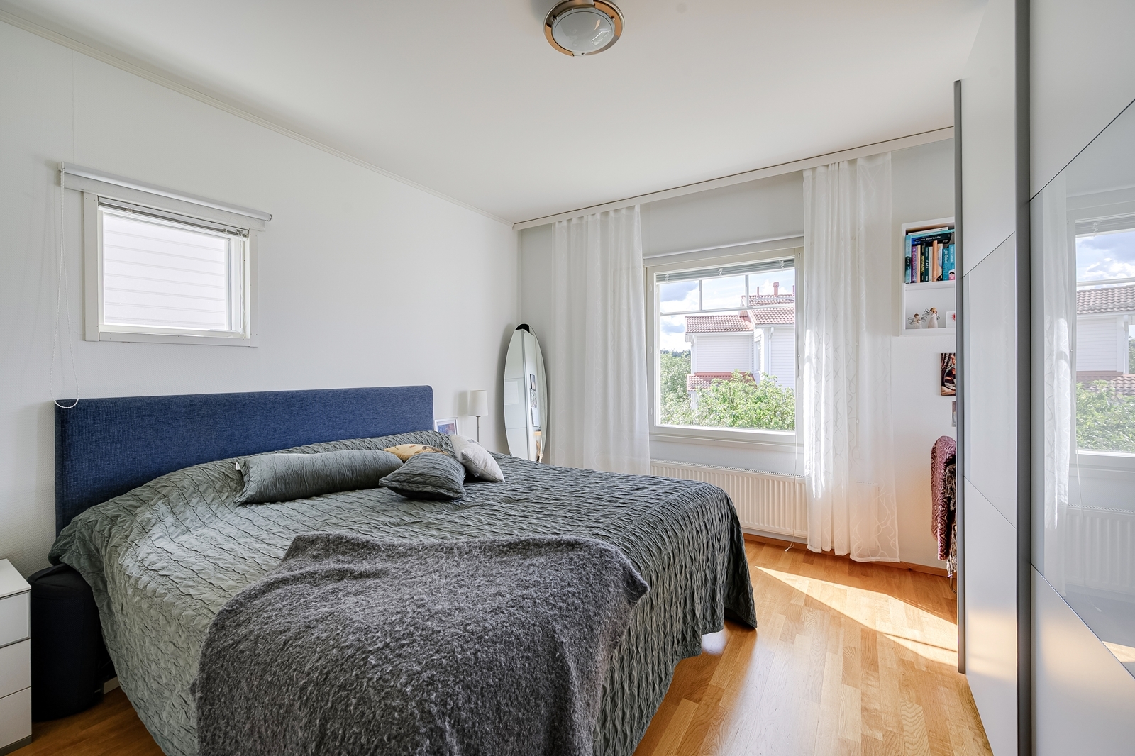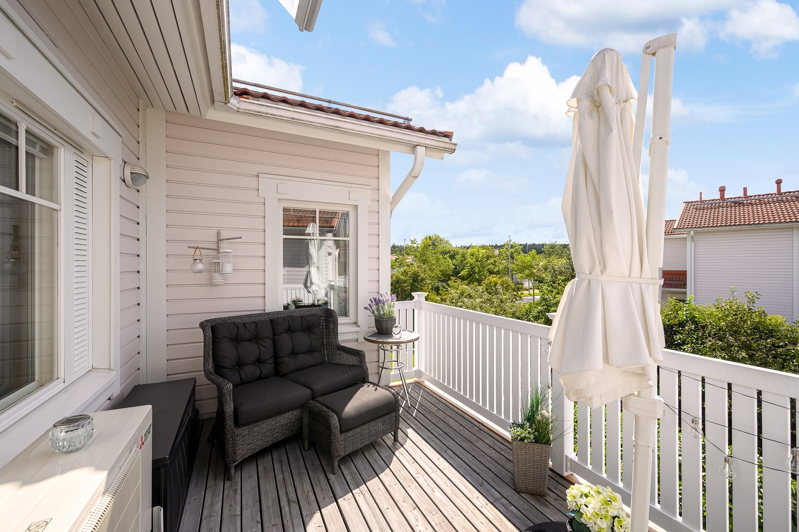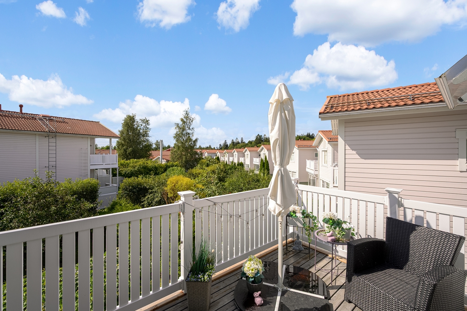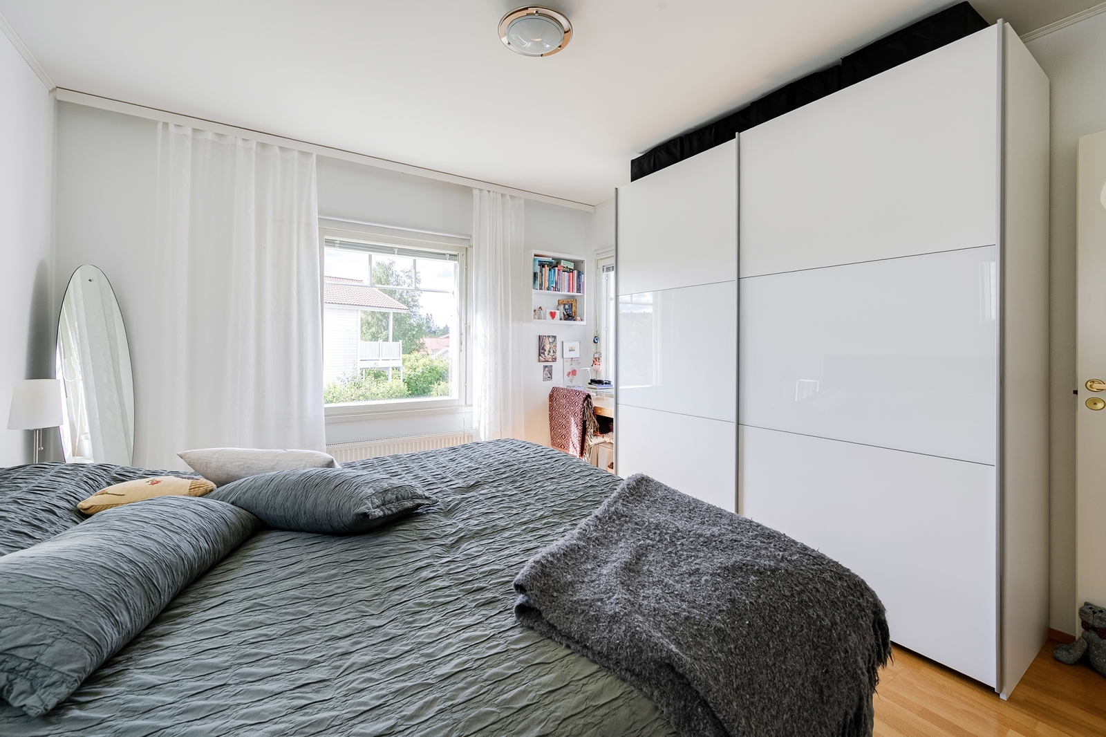 Yläkerrassa on 2 iso makuuhuonetta ja oleskelutila/yläkerran olohuone. Saunatila ja kylpyhuone sekä viihtyisä parveke, josta avautuu upeat näkymät.