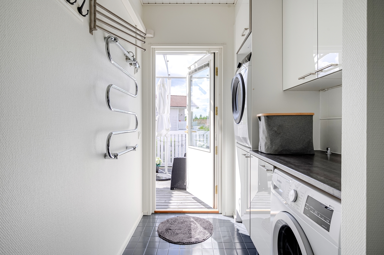 Lattialämmitys, silityspöytä/taso, pesukoneliitäntä ja lattiakaivo, lattiat (laatta), seinät (maali ja kaakeli), Kodinhoitotila on uusittu 2022, tasot ja kaapin ovet, hanat ja allas uusittu 2022. |
