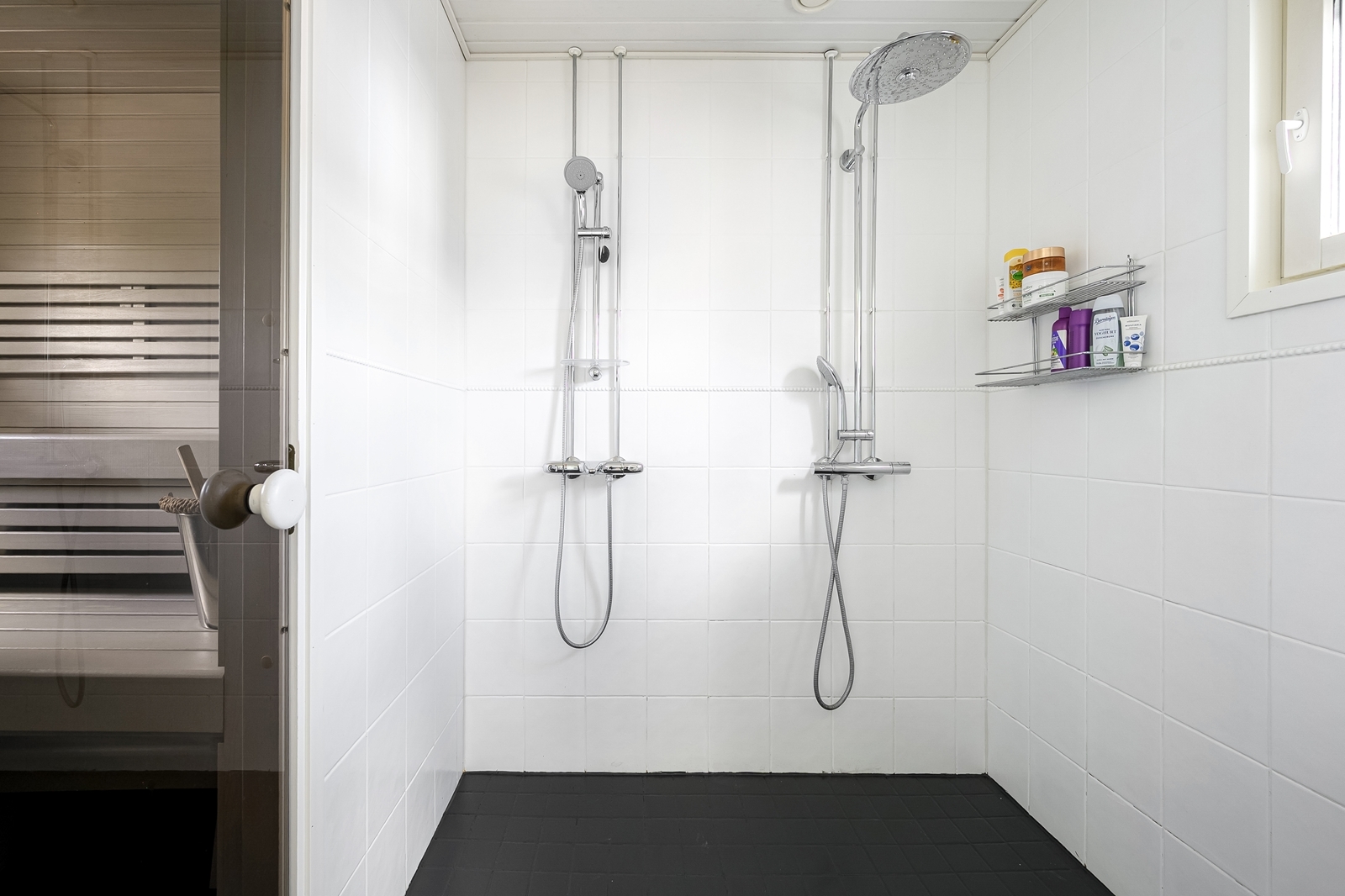 Lattialämmitys, peilikaappi, suihku ja kiinteät valaisimet, seinät (kaakeli), lattiat (laatta) |