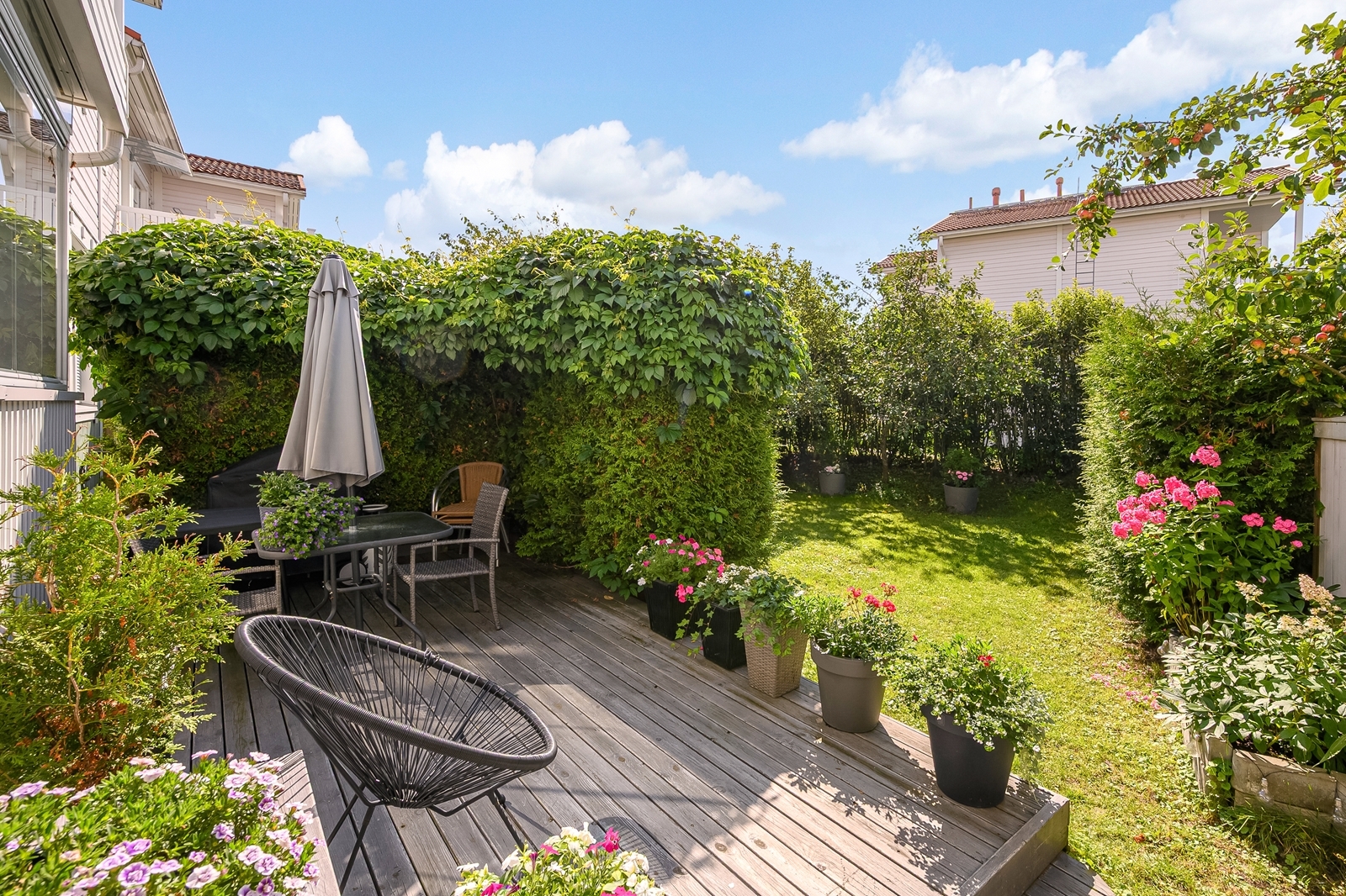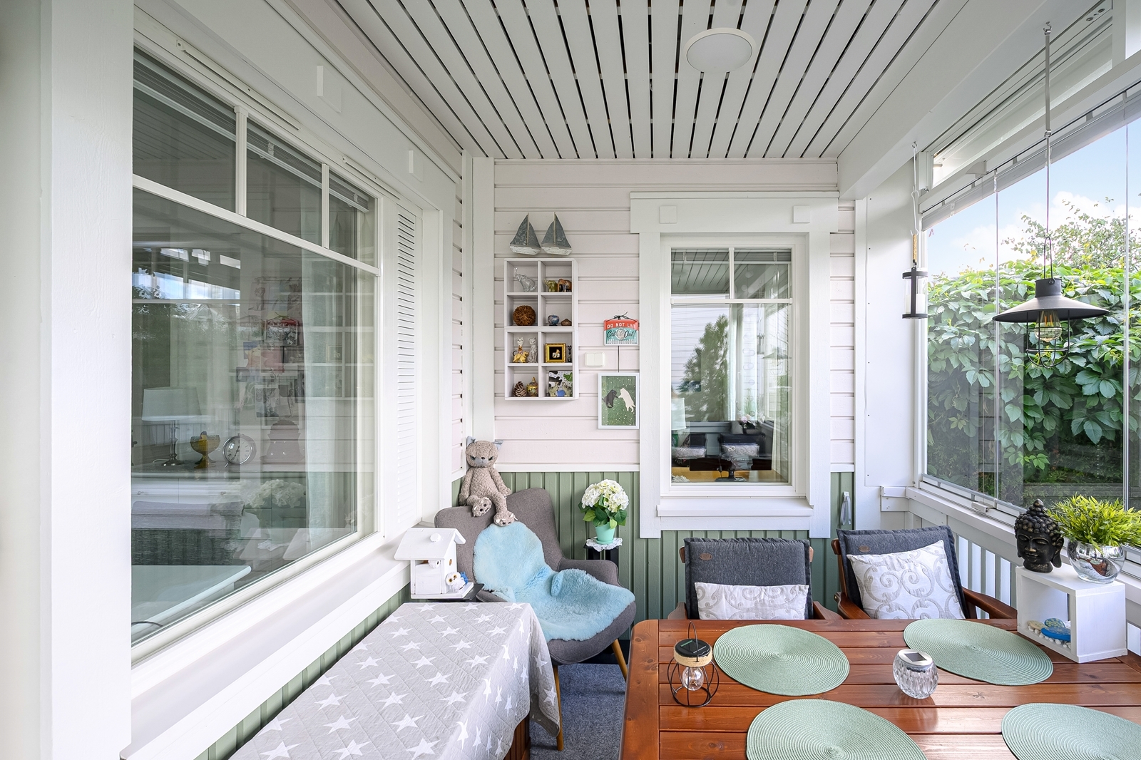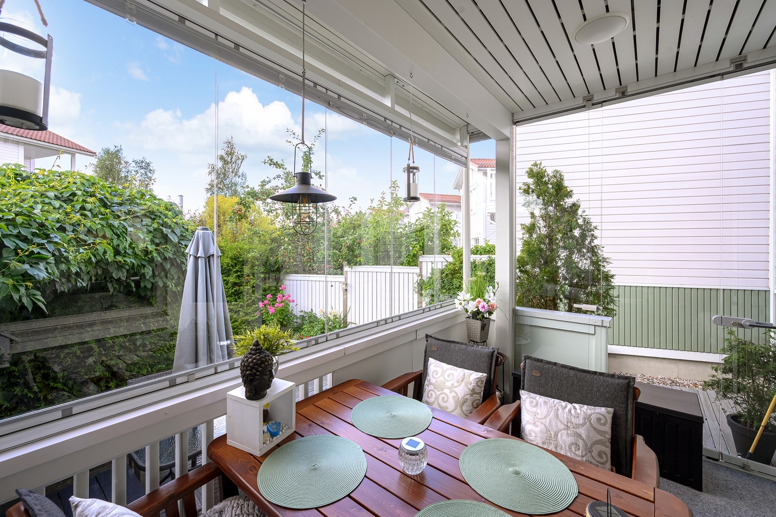 Suojaisa iso piha-alue sekä 2014 Lumonin lasitettu terassi. Piha-alueella istuksia sekä omenapuu.