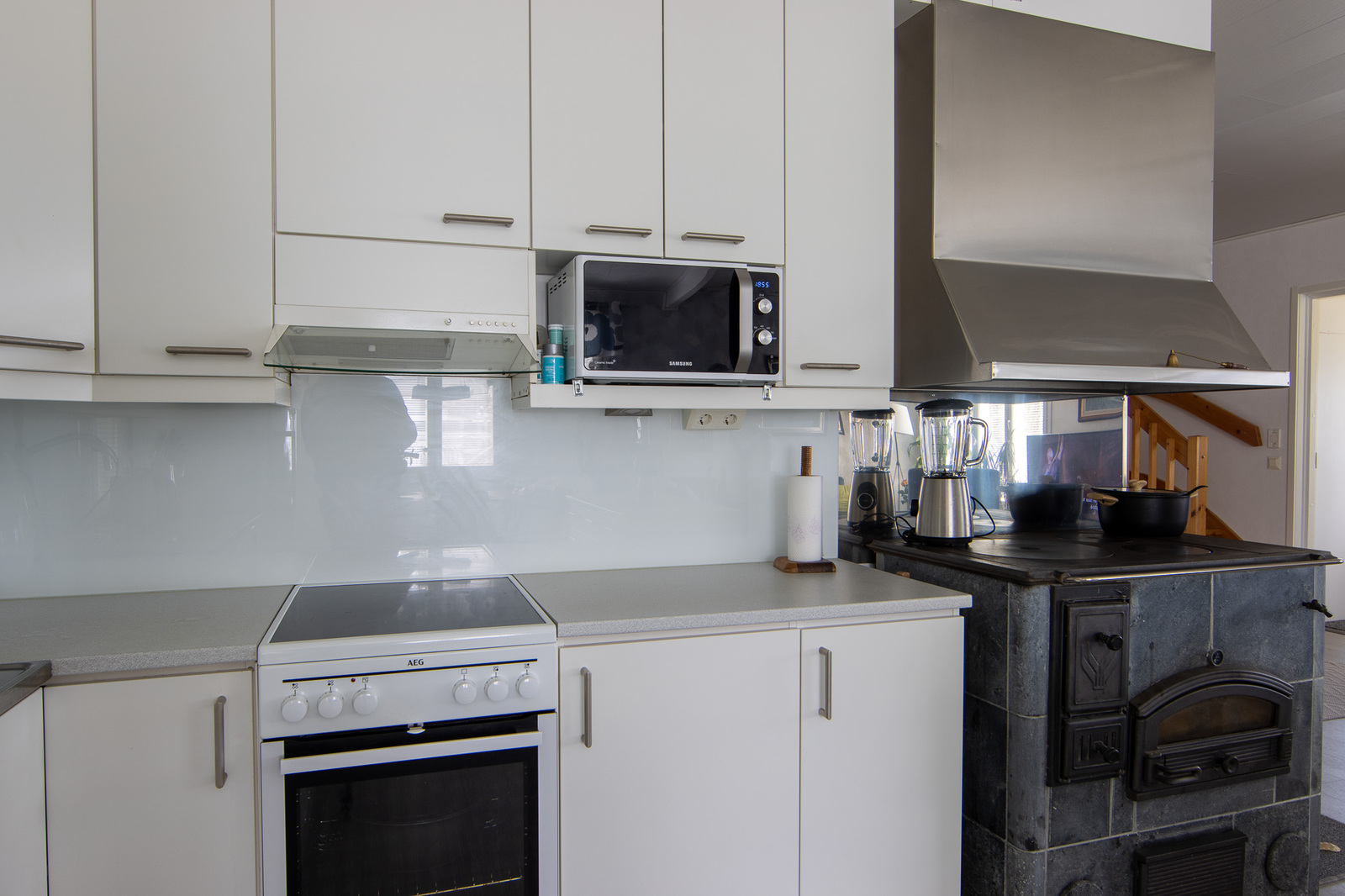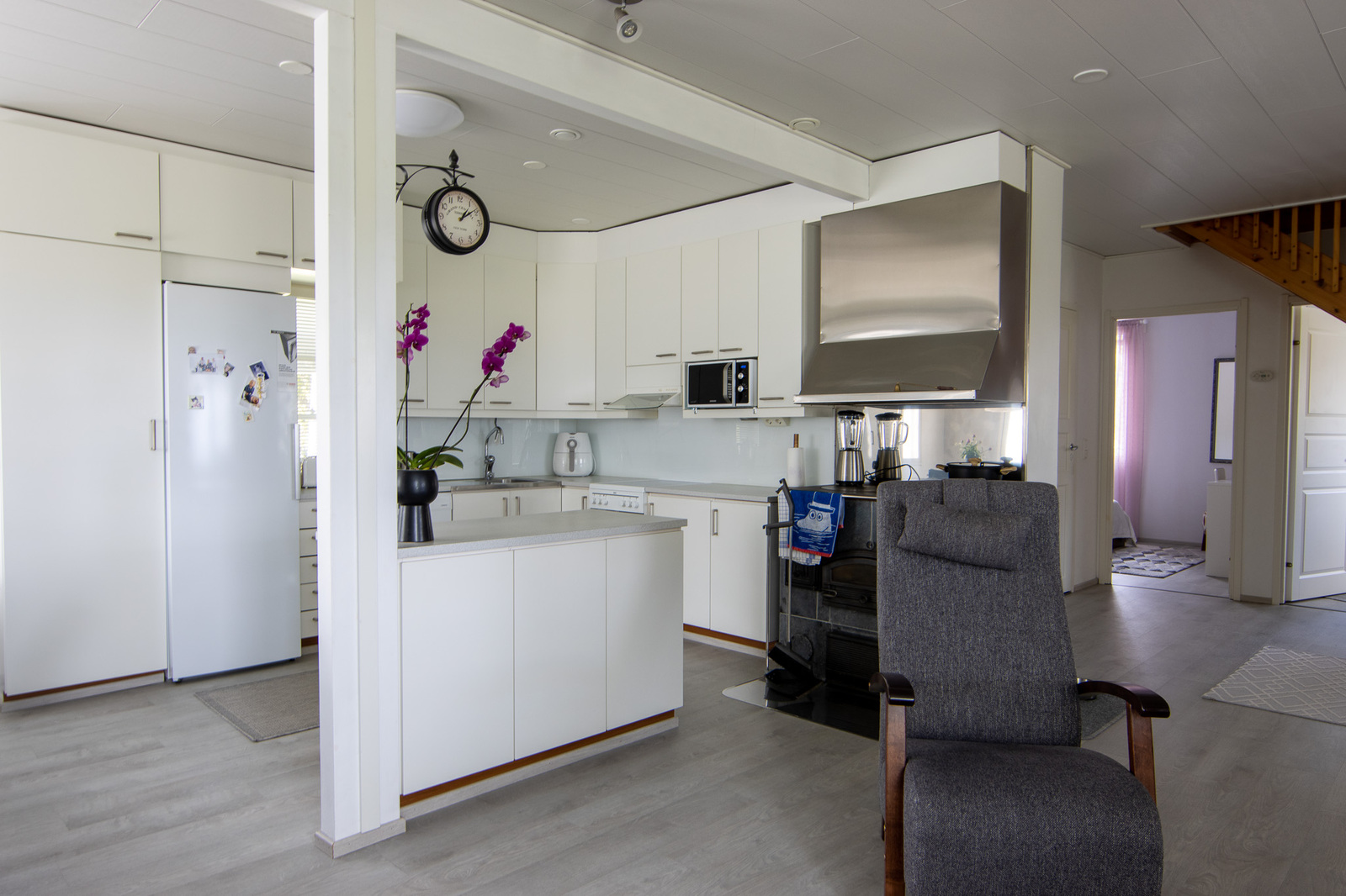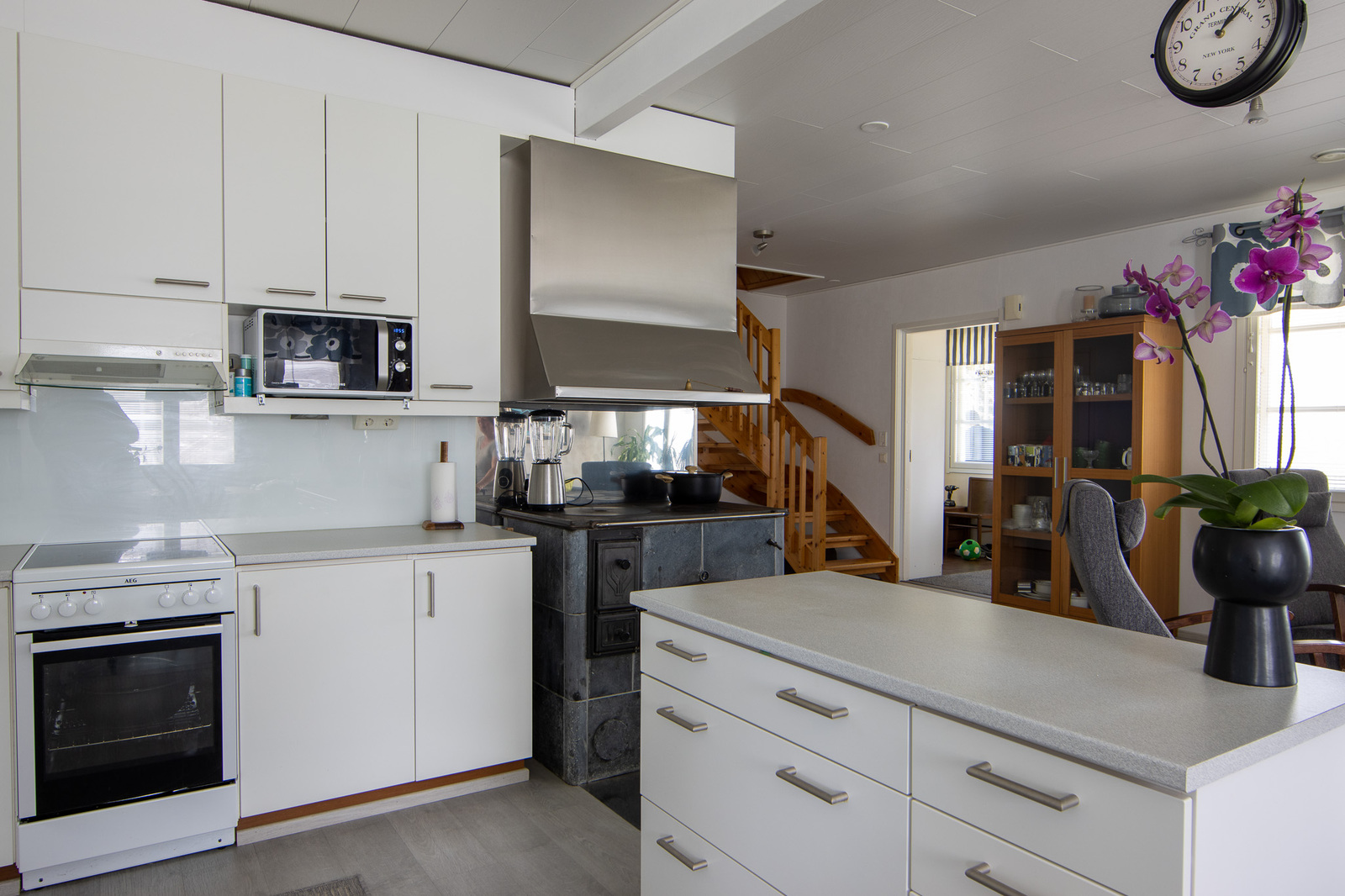 Liesi (Induktioliesi), työtasot (laminaatti), seinät (tapetti), lattiat (vinyyli), liesi, astianpesukone, jääkaappi, mikroaaltouuni ja kiinteät valaisimet, liesituuletin / hormi |