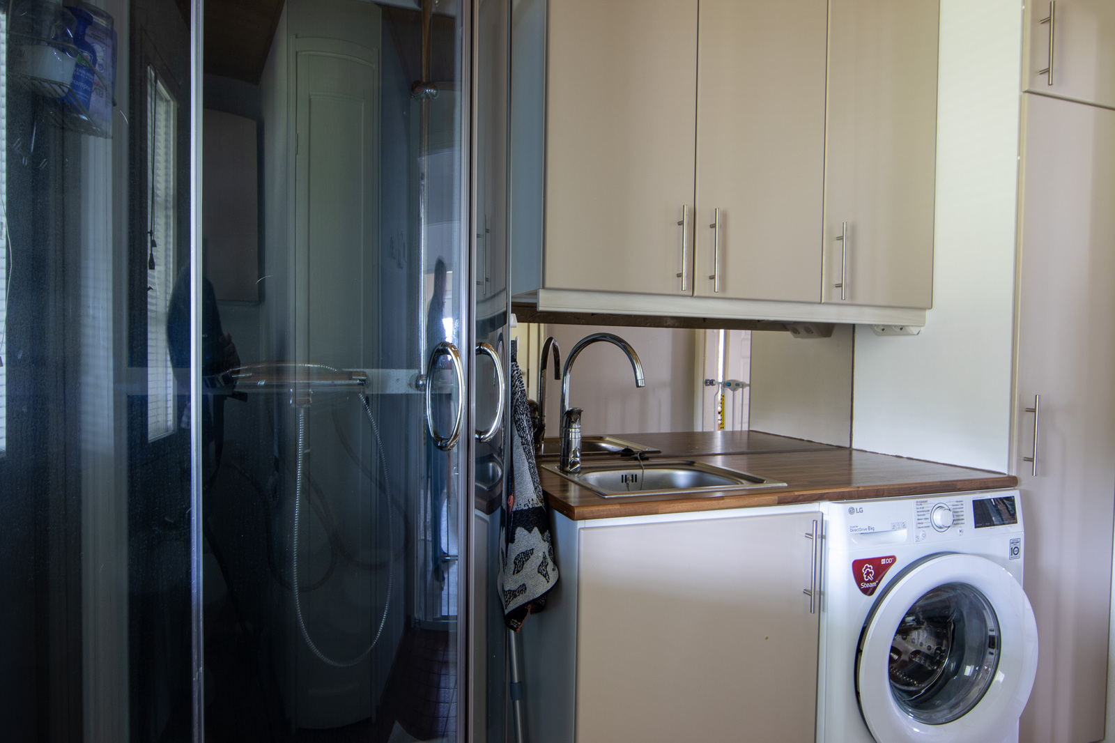 Pesukoneliitäntä, silityspöytä/taso, lattialämmitys, pyykkikaapit, pesuallas ja lattiakaivo, lattiat (laatta), seinät (maali ja kaakeli) |