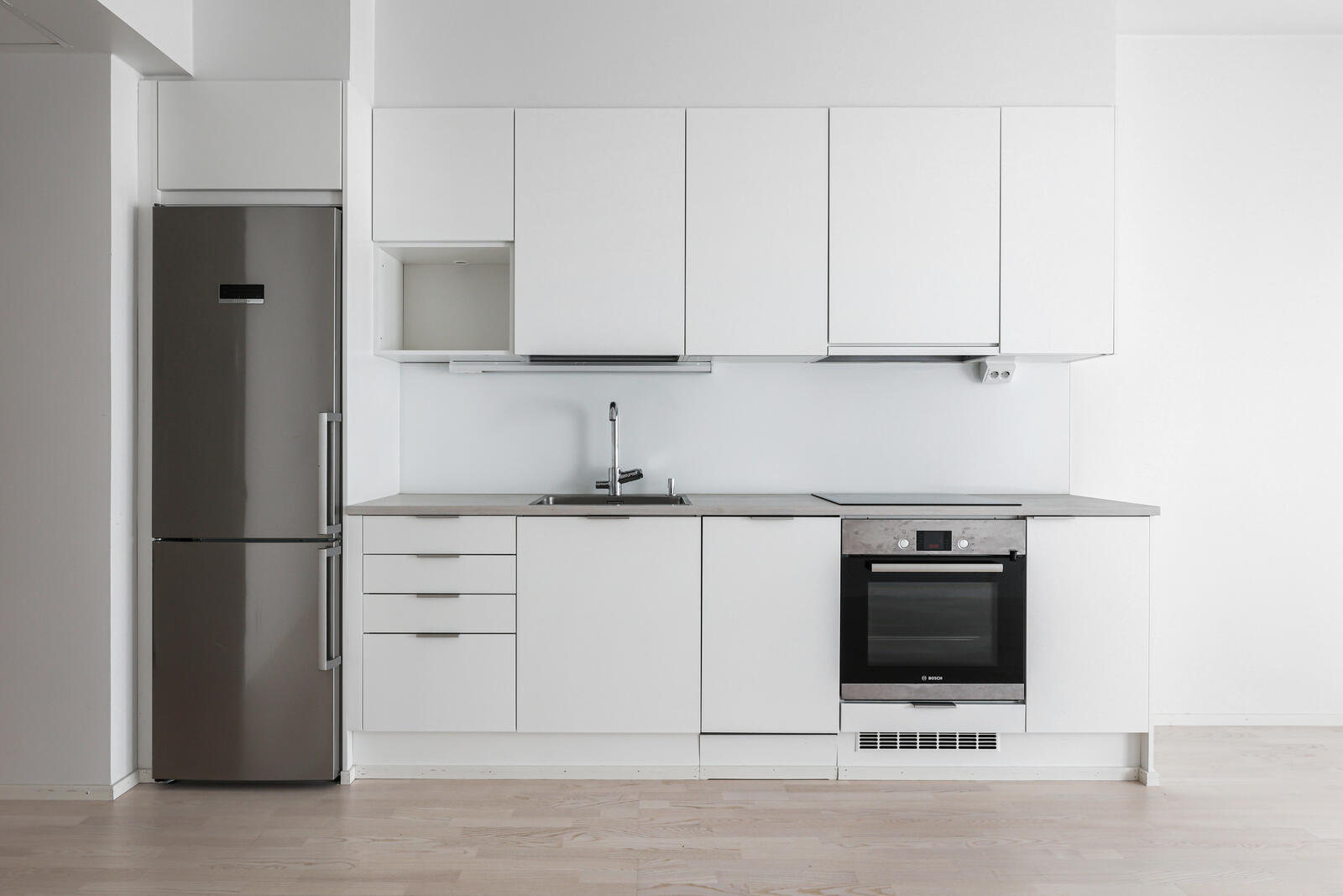 | Keittiön kuvaus | Liesi (liesitaso, erillisuuni), työtasot (laminaatti), seinät (maali), lattiat (parketti), erillisuuni, jääkaappipakastin, liesituuletin ja liesitaso, kiinteät valaisimet |