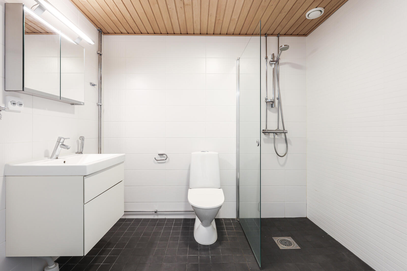 | Kylpyhuoneen kuvaus | Suihkuseinä, suihku, pesukoneliitäntä, wc-istuin, peilikaappi ja kiinteät valaisimet, seinät (kaakeli), lattiat (laatta) |