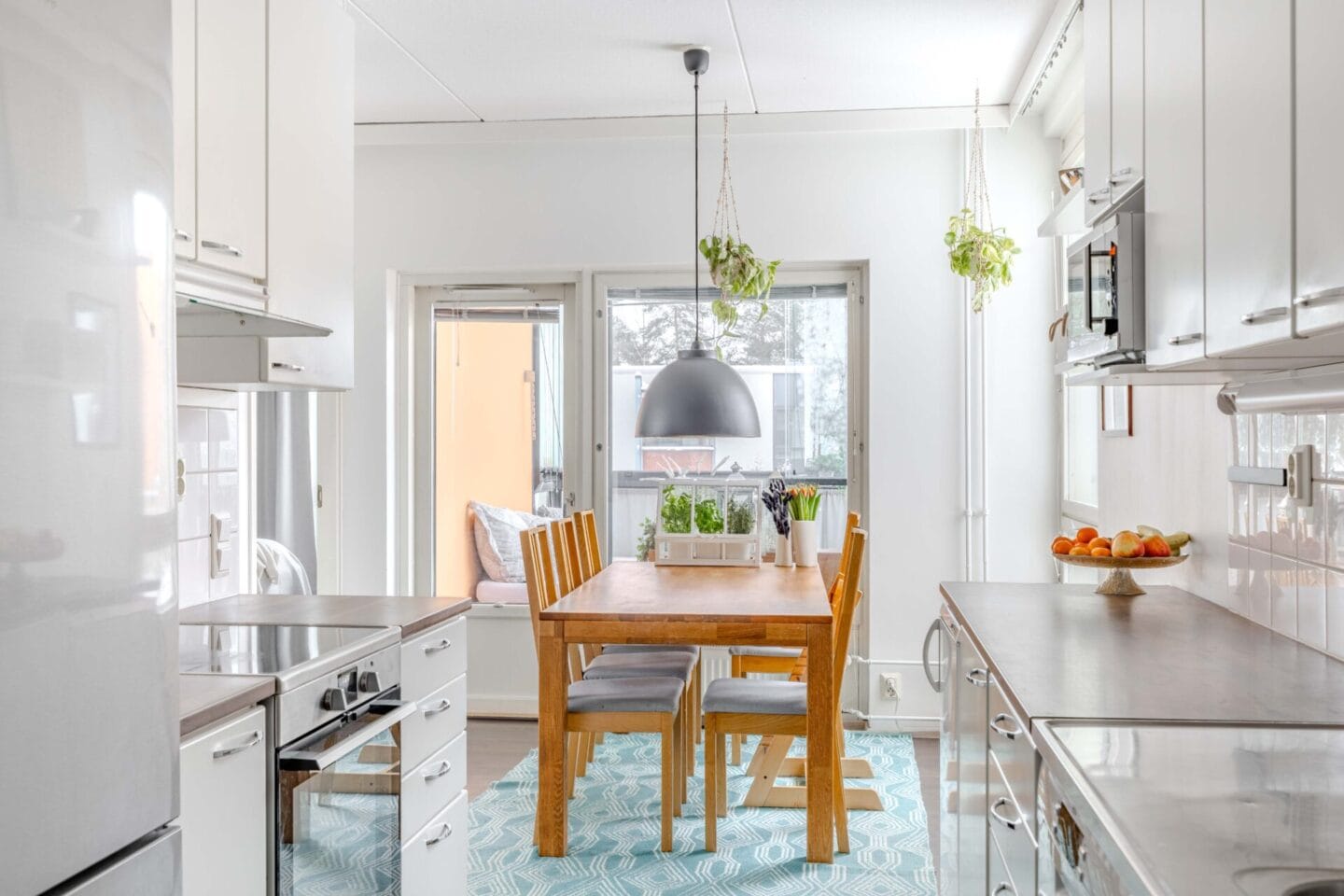 Keittiössä on hyvin työskentely, – ja säilytystilaa. Keittiön yhteydessä oleva ruokailutila kutsuu kokoontumaan yhteisiin hetkiin, ja tilaan mahtuu suurempikin ruokapöytä. Ruokailutilasta on käynti tilavalle lasitetulle parvekkeelle, joka toimii lisähuoneena alkukeväästä, pitkälle syksyyn ja tarjoaa viihtyisän paikan rentoutumiseen. Arjen luksusta tuo ikkunallinen sauna, käyttömukavuutta tuo erillinen wc.