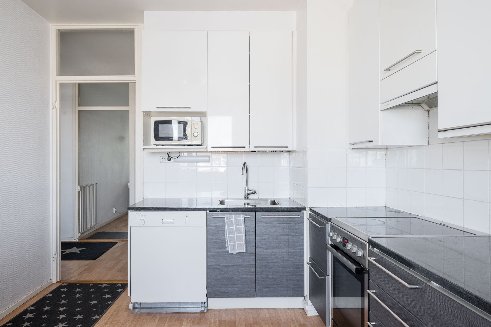 Liesi (Keraaminen liesi), seinät (lasikuitutapetti), lattiat (laminaatti), astianpesukone, jääkaappipakastin ja liesituuletin |