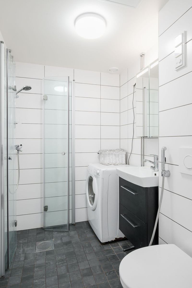 Pesukoneliitäntä, lattialämmitys, peilikaappi, wc-istuin ja suihku, seinät (kaakeli), lattiat (laatta) |