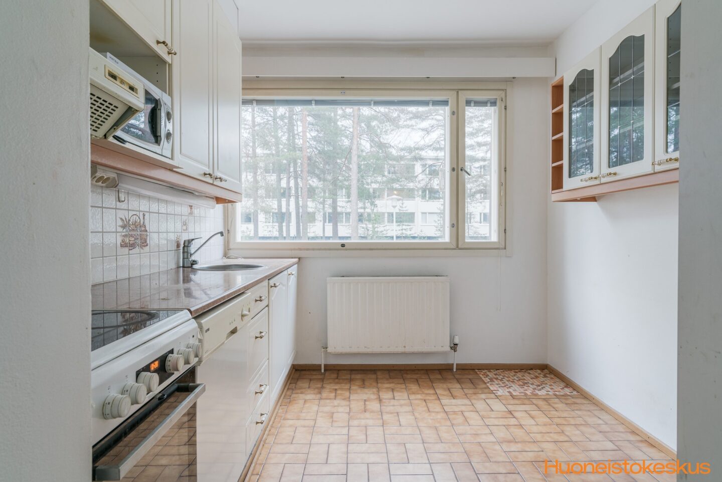 | Keittiön kuvaus | Liesi (Keraaminen liesi), työtasot (laminaatti), seinät (maali ja kaakeli), lattiat (laatta), jenkkikaappi, liesi, liesituuletin, mikroaaltouuni, astianpesukone ja uuni |