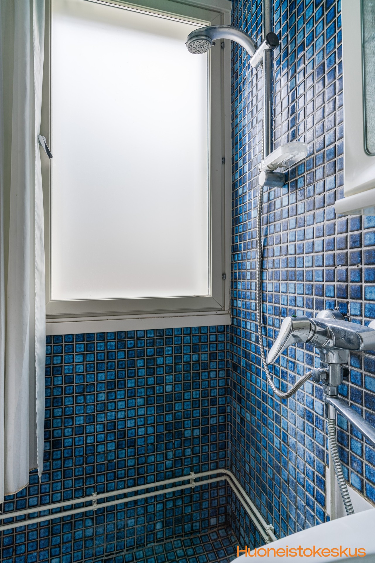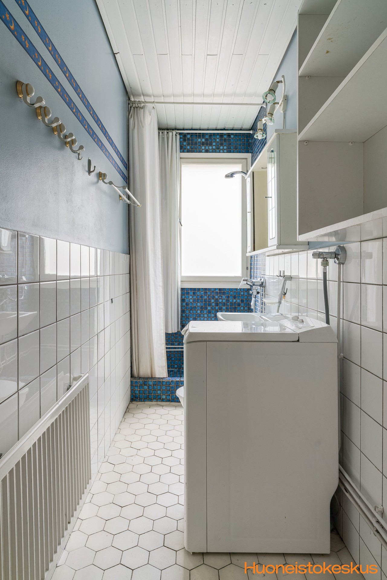| Kylpyhuoneen kuvaus | WC-istuin, suihku, pesukone, pesukoneliitäntä, peilikaappi, pesuallas, bidee-suihku ja allaskaappi, seinät (kaakeli), lattiat (laatta) |