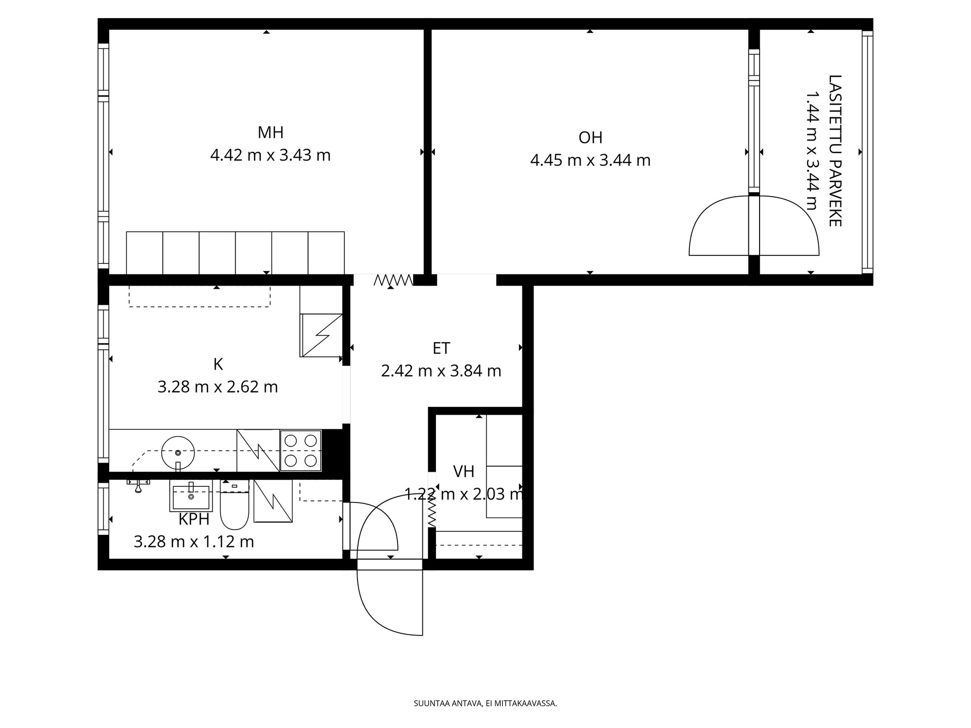 | Huoneistoselitelmä | Oh, mh, k, et, vh, kph, lasitettu parveke |