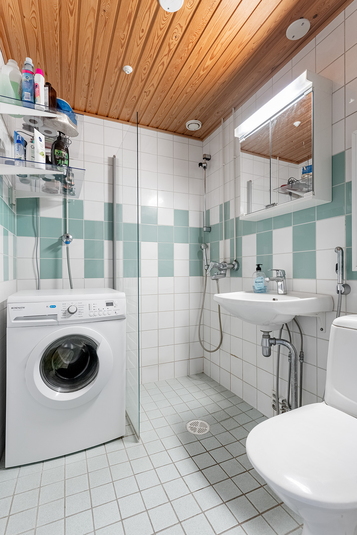 | Kylpyhuoneen kuvaus | WC-istuin, suihku, pesukoneliitäntä, peilikaappi ja suihkuseinä, seinät (kaakeli), lattiat (laatta) |